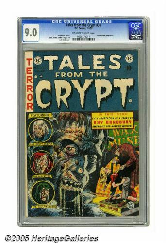 <B>Tales From the Crypt #34 (EC, 1953) CGC VF/NM 9.0 Off-white to white pages.</B></I> Nice copy of an issue that shows off the cover art talents of Jack Davis. Davis, George Evans, Jack Kamen, and Graham Ingels provide the interior art, the latter on a Ray Bradbury adaptation. Used in <B>Parade of Pleasure</B></I> (just some harmless negligee panels - what's wrong with <I>that</B></I>?). Overstreet 2005 VF/NM 9.0 value = $444; NM- 9.2 value = $580. CGC census 7/05: 3 in 9.0, 9 higher.