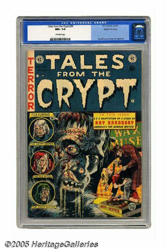 <B>Tales From the Crypt #34 Gaines File pedigree 1/12 (EC, 1953) CGC NM+ 9.6 Off-white pages.</B></I> Jack Davis created one of his creepiest covers for this issue, which must have had some good stuff on the interior as well because it's cited in <B>Parade of Pleasure</B></I>. Other highlights include an adaptation of Ray Bradbury's "There Was An Old Woman" with Graham Ingels art. George Evans and Jack Kamen also contribute artwork. The grade here is the highest CGC has certified to date for issue #34. Overstreet 2005 NM- 9.2 value = $580. CGC census 6/05: 3 in 9.6, none higher.
