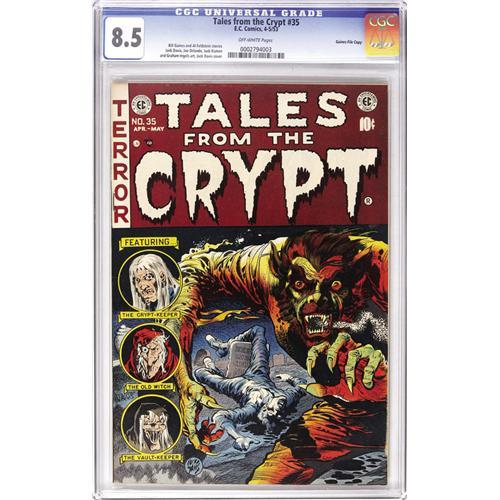<B>Tales From the Crypt #35 Gaines File pedigree 7/11 (EC, 1953) CGC VF+ 8.5 Off-white pages.</B></I> "One of EC's most vivid horror images" is what James Van Hise called this Jack Davis cover... how could anyone disagree? The issue also has the infamous story drawn by Joe Orlando in which vampires attach a spigot to their victim's neck... There's also the work of Jack Kamen and Graham Ingels in the issue, plus more by Davis. Overstreet 2006 VF 8.0 value = $310; VF/NM 9.0 value = $465. CGC census 6/06: 1 in 8.5, 12 higher. <BR><BR><B>Important notice:</B> Heritage usually auctions material at the rate of 200-250 lots per hour. On some occasions eBay Live bid software or the Internet may not be able to keep up with the pace of the auction. We recommend placing a realistic absentee bid now as insurance to avoid disappointment. Occasionally the auctioneer may eliminate or reject an eBay Live bid, and the auctioneer may also reopen a lot after the close of the eBay live bidding (usually because we missed an audience bid), and may reject your bid even if it shows you as the winning bidder. By bidding via eBay Live, you agree that Heritage may award the lot to another bidder at its sole discretion under the circumstances described above or any other reasonable circumstances. Since eBay bids are not shown to us until we open the lot on the floor, we treat those bids just like floor bids. In most cases the floor responds before the eBay bid is presented to us, due to Internet lag time, so for consistency we have made it a policy that floor bids are always considered first over tie eBay live bids. Also please note that all Heritage lots purchased through eBay Live carry a 22.5% Buyer's Premium. Please make sure you read the Terms and Conditions before you bid. This lot is being auctioned in conjunction with a live floor auction by Heritage Auction Galleries. All final auction and invoice information will be supplied by Heritage Auction Galleries, and all other information should be considered preliminary. Lot:41001 <BR><BR><B>Winning Notification and Billing:</B> After the FINAL session in this auction is complete, Heritage will send e-mail and snail mail invoices. This process normally takes several days. All final auction and invoice information will be supplied by Heritage Auction Galleries, and all other information should be considered preliminary. <BR><BR>This auction will be conducted on a live auction floor and over the Internet through eBay Live. If you choose to place an absentee bid, please take a moment to <font color='#0000ff'><u><a href='http://pages.ebay.com/liveauctions/help/before/laabsentee.html'>learn how eBay Live absentee bidding works</a></u></font><font color='#000000'>