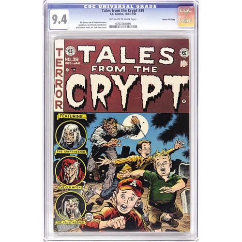 <B>Tales From the Crypt #39 Gaines File pedigree 5/11 (EC, 1953) CGC NM 9.4 Off-white to white pages.</B></I> The upper end of the CGC census for this issue is quite sparsely populated compared to other ECs, and it puts this Gaines File copy among the best available. This issue's remembered for the story "Shadow of Death." drawn by Graham Ingels. The story was dubbed "a classic of comic book horror" by comics historian James Van Hise, and we certainly concur! The issue also has art by Jack Davis, Joe Orlando, and Jack Kamen; the cover is by Davis. Overstreet 2006 NM- 9.2 value = $620. CGC census 5/06: 2 in 9.4, 1 higher. <BR><BR><B>Important notice:</B> Heritage usually auctions material at the rate of 200-250 lots per hour. On some occasions eBay Live bid software or the Internet may not be able to keep up with the pace of the auction. We recommend placing a realistic absentee bid now as insurance to avoid disappointment. Occasionally the auctioneer may eliminate or reject an eBay Live bid, and the auctioneer may also reopen a lot after the close of the eBay live bidding (usually because we missed an audience bid), and may reject your bid even if it shows you as the winning bidder. By bidding via eBay Live, you agree that Heritage may award the lot to another bidder at its sole discretion under the circumstances described above or any other reasonable circumstances. Since eBay bids are not shown to us until we open the lot on the floor, we treat those bids just like floor bids. In most cases the floor responds before the eBay bid is presented to us, due to Internet lag time, so for consistency we have made it a policy that floor bids are always considered first over tie eBay live bids. Also please note that all Heritage lots purchased through eBay Live carry a 22.5% Buyer's Premium. Please make sure you read the Terms and Conditions before you bid. This lot is being auctioned in conjunction with a live floor auction by Heritage Auction Galleries. All final auction and invoice information will be supplied by Heritage Auction Galleries, and all other information should be considered preliminary. Lot:41001 <BR><BR><B>Winning Notification and Billing:</B> After the FINAL session in this auction is complete, Heritage will send e-mail and snail mail invoices. This process normally takes several days. All final auction and invoice information will be supplied by Heritage Auction Galleries, and all other information should be considered preliminary. <BR><BR>This auction will be conducted on a live auction floor and over the Internet through eBay Live. If you choose to place an absentee bid, please take a moment to <font color='#0000ff'><u><a href='http://pages.ebay.com/liveauctions/help/before/laabsentee.html'>learn how eBay Live absentee bidding works</a></u></font><font color='#000000'>