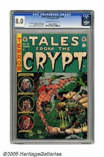 <B>Tales From the Crypt #40 (EC, 1954) CGC VF 8.0 Off-white to white pages.</B></I> Jack Davis cover. Davis, George Evans, Bernie Krigstein, and Graham Ingels art. Used in Senate hearings and in <B>Hartford Courant</B></I> anti-comics editorials. Overstreet 2005 VF 8.0 value = $300. CGC census 5/05: 4 in 8.0, 8 higher.
