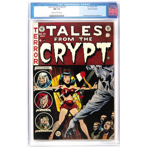 <B>Tales From the Crypt #41 Gaines File pedigree 1/12 (EC, 1954) CGC NM 9.4 Off-white to white pages.</B></I> A wonderfully frightening scene on the cover sets the mood for this issue. Interior art is by the incredibly talented cast of Jack Davis, George Evans, Jack Kamen, and Graham Ingels. This comic's deep blacks, bright whites, sharp corners, and all-around freshness make this book every bit the 9.4 that the CGC's graders have assigned it. This copy is tied with two others as the highest CGC-graded to date. Overstreet 2006 NM- 9.2 value = $600. CGC census 10/06: 3 in 9.4, none higher.<BR><BR><b>Shipping:</b> Slabbed Comic (<a target="_blank" href="http://www.heritageauctions.com/common/shipping.php">view shipping information</a>)