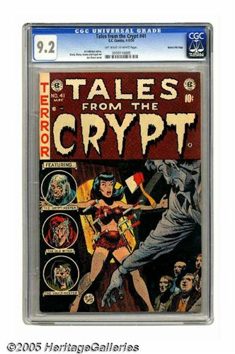 <B>Tales From the Crypt #41 Gaines File pedigree 12/12 (EC, 1954) CGC NM- 9.2 Off-white to white pages.</B></I> One of Jack Davis' most chilling covers highlights this issue. Davis, George Evans, Jack Kamen, and Graham Ingels serve up tastefully horrific story art. Overstreet 2005 NM- 9.2 value = $560. CGC census 5/05: 1 in 9.2, 3 higher.