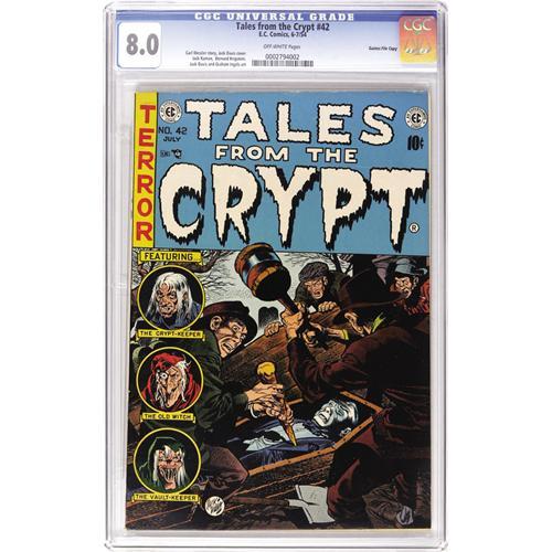 <B>Tales From the Crypt #42 Gaines File pedigree 12/12 (EC, 1954) CGC VF 8.0 Off-white pages.</B></I> Jack Davis cover. Davis, Jack Kamen, Bernie Krigstein, and Graham Ingels art. Overstreet 2006 VF 8.0 value = $302. CGC census 6/06: 3 in 8.0, 5 higher. <BR><BR><B>Important notice:</B> Heritage usually auctions material at the rate of 200-250 lots per hour. On some occasions eBay Live bid software or the Internet may not be able to keep up with the pace of the auction. We recommend placing a realistic absentee bid now as insurance to avoid disappointment. Occasionally the auctioneer may eliminate or reject an eBay Live bid, and the auctioneer may also reopen a lot after the close of the eBay live bidding (usually because we missed an audience bid), and may reject your bid even if it shows you as the winning bidder. By bidding via eBay Live, you agree that Heritage may award the lot to another bidder at its sole discretion under the circumstances described above or any other reasonable circumstances. Since eBay bids are not shown to us until we open the lot on the floor, we treat those bids just like floor bids. In most cases the floor responds before the eBay bid is presented to us, due to Internet lag time, so for consistency we have made it a policy that floor bids are always considered first over tie eBay live bids. Also please note that all Heritage lots purchased through eBay Live carry a 22.5% Buyer's Premium. Please make sure you read the Terms and Conditions before you bid. This lot is being auctioned in conjunction with a live floor auction by Heritage Auction Galleries. All final auction and invoice information will be supplied by Heritage Auction Galleries, and all other information should be considered preliminary. Lot:41001 <BR><BR><B>Winning Notification and Billing:</B> After the FINAL session in this auction is complete, Heritage will send e-mail and snail mail invoices. This process normally takes several days. All final auction and invoice information will be supplied by Heritage Auction Galleries, and all other information should be considered preliminary. <BR><BR>This auction will be conducted on a live auction floor and over the Internet through eBay Live. If you choose to place an absentee bid, please take a moment to <font color='#0000ff'><u><a href='http://pages.ebay.com/liveauctions/help/before/laabsentee.html'>learn how eBay Live absentee bidding works</a></u></font><font color='#000000'>