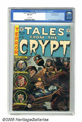 <B>Tales From the Crypt #42 Gaines File pedigree (EC, 1954) CGC NM 9.4 Off-white pages.</B></I> Staking his claim to this issue's cover was Jack Davis, one of EC's most prolific artists. On this title alone, Davis created 18 of the 27 covers, and contributed interior story art on 23 issues. He gets help from Jack Kamen and Graham Ingels in this issue, as well as from Bernard Krigstein, whose story "The Bath" looks at a cleanliness-obsessed tyrant who gets his just deserts. While CGC has certified this book as a Gaines File copy, no certificate is included with this lot. Overstreet 2005 NM- 9.2 value = $560. CGC census 6/05: 2 in 9.4, none higher.