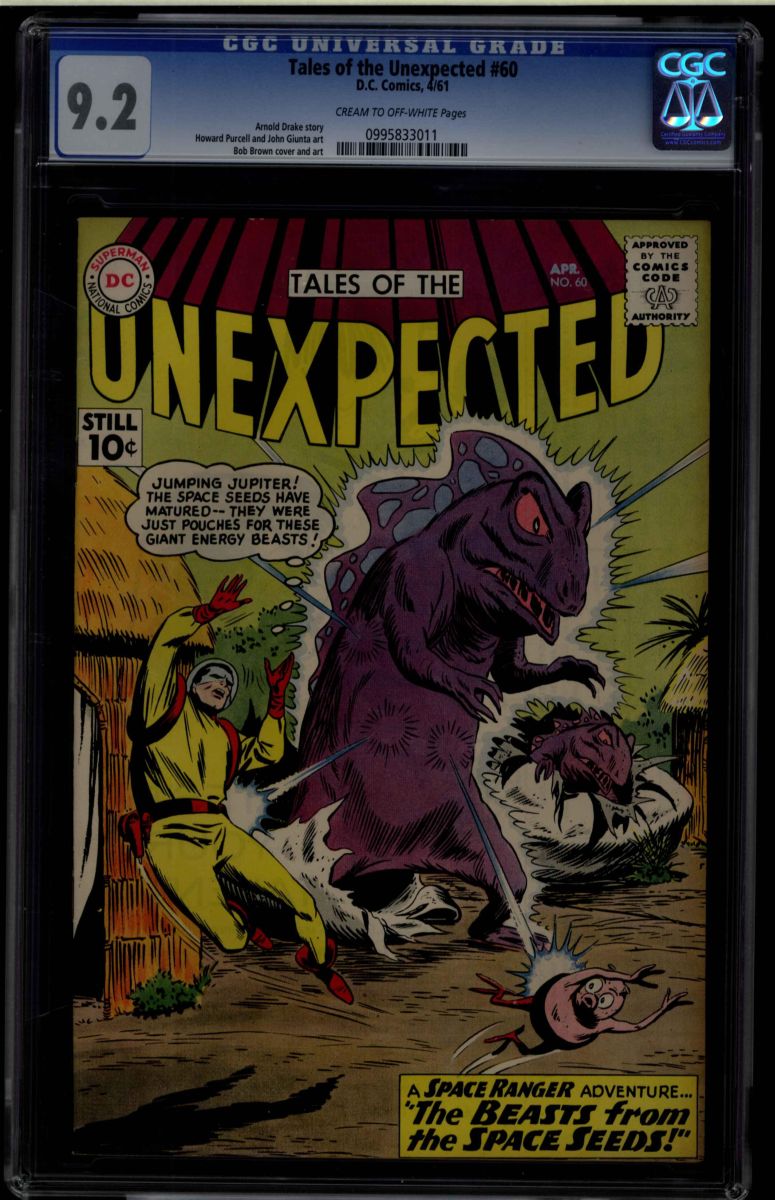 Tales Of The Unexpected #60 CGC 9.2 cream to off-white. Arnold Drake story Howard Purcell and John Giunta art Bob Brown cover and art. Overstreet 2009 9.2 value = $300. CGC universal census reports 1 at 9.2, none better!
