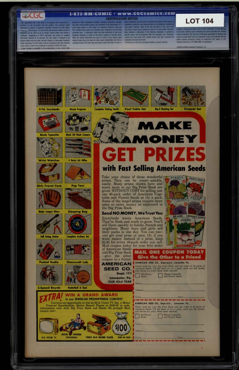 The Auctioneer has reserved the right to reject any and all bids, and to bid at the auction. Auctioneers Auctions are not on approval. Auctioneer does not allow certified material to be returned because of possible differences of opinion with respect to the grade offered by any third party organization, dealer, or service. Absolutely no guarantee of grade is offered for un-certified property sold and subsequently submitted to a third-party grading service. There will be no exceptions to this policy. Under extremely limited circumstances, (e.g. gross cataloging error) a purchaser, who did not bid from the floor, may request Auctioneer to evaluate voiding a sale; such request must be made in writing detailing the alleged gross error, and submission of the lot to the Auctioneer must be pre-approved by the Auctioneer. Bidder must notify Auctioneer in writing of such request within three (3) days of the non-floor bidder receipt of the lot. Any lot that is to be evaluated must be in our offices within 30 days after Auction. Grading does not qualify for this evaluation process nor do such complaints constitute a basis to challenge the authenticity of a lot. AFTER THAT 30-DAY PERIOD, NO LOTS MAY BE RETURNED FOR REASONS OTHER THAN AUTHENTICITY. Lots returned must be housed intact in the original holder. No lots purchased by floor Bidders may be returned (including those Bidders acting as agents for others). Late remittance for purchases may be considered just cause to revoke all return privileges. B: Auctions conducted solely on the Internet have a THREE (3) DAY RETURN POLICY: Lots paid for within seven days of the Auction closing are sold with a three (3) day return privilege. You may return lots under the following conditions: Within three days of receipt of the lot, you must first notify Auctioneer by contacting Client Service by phone (314-680-8599) or e-mail (moundcityauctions@gmail.com), and immediately mail the lot(s) fully insured to the attention of Returns, Mound City Auctions 1081 Teson Rd. Hazelwood, MO. 63042. Lots must be housed intact in their original holder and in their original condition. You are responsible for the insured, safe delivery of any lots. Auctioneer will not be responsible for lots returned in non-registered mail or lots returned without prior authorization per section B. A non-negotiable return fee of 5% of the purchase price ($10 per lot minimum) will be deducted from the refund for each returned lot or billed directly. Postage and handling fees are not refunded. After the three-day period (from receipt), no items may be returned for any reason. Late remittance for purchases revokes all Return-Restock privileges. C: Bidders who have inspected the lots prior to the auction will not be granted any return privileges. D: Comic books sold referencing a third-party grading service are sold “as is” without any express or implied warranty. Certain warranties may be available from the grading services and the Bidder is referred to them for further details: Certified Guaranty Company, LLC. (CGC), P.O. Box 4738, Sarasota, FL 34230. E: Bidders who intend to challenge authenticity or provenance of a lot must notify Auctioneer in writing within thirty (30) days of the Auctions conclusion. In the event Auctioneer cannot deliver the lot or subsequently it is established that the lot lacks title, provenance, authenticity, or other transfer or condition issue is claimed, Auctioneer's liability shall be limited to rescission of sale and refund of purchase price; in no case shall Auctioneer's maximum liability exceed the high bid on that lot, which bid shall be deemed for all purposes the value of the lot. After one year has elapsed, Auctioneer's maximum liability shall be limited to any commissions and fees Auctioneer earned on that lot. F: All comics are guaranteed genuine, but are not guaranteed as to grade, since grading is a matter of opinion, an art and not a science, and therefore the opinion rendered by the Auctioneer or any third party grading service may not agree with the opinion of others (including trained experts), and the same expert may not grade the same item with the same grade at two different times. G: Since we cannot examine encapsulated comics, they are sold “as is”without our grading opinion, and may not be returned for any reason. Auctioneer shall not be liable for any patent or latent defect or controversy pertaining to or arising from any encapsulated collectible. In any such instance, purchaser's remedy, if any, shall be solely against the service certifying the collectible. H: Due to changing grading standards over time, differing interpretations, and to possible mishandling of items by subsequent owners, Auctioneer reserves the right to grade items differently than shown on certificates from any grading service that accompany the items. Auctioneer also reserves the right to grade items differently than the grades shown in the prior catalog should such items be reconsigned to any future auction. I: Although consensus grading is employed by most grading services, it should be noted as aforesaid that grading is not an exact science. In fact, it is entirely possible that if a lot is broken out of a plastic holder and resubmitted to another grading service or even to the same service, the lot could come back with a different grade assigned. J: Certification does not guarantee protection against the normal risks associated with potentially volatile markets. The degree of liquidity for certified collectibles will vary according to general market conditions and the particular lot involved. For some lots there may be no active market at all at certain points in time."