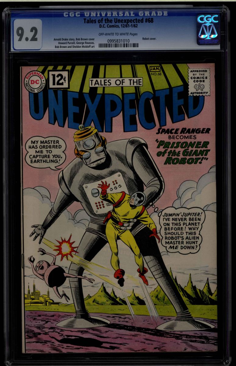 Tales Of The Unexpected #68 CGC 9.2 off-white to white pages. Arnold Drake story Bob Brown cover, Howard Purcell George Roussos Bob Brown and Sheldon Moldoff art. Robot cover. Overstreet 2009 NM 9.2 value = $135. CGC census: 1 at 9.2, none higher!