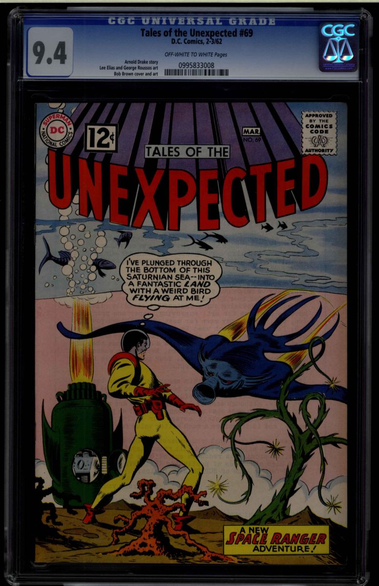 Tales Of The Unexpected #69 CGC 9.4 off-white to white. Arnold Drake story Lee Elias and George Roussos art Bob Brown cover and art. Overstreet 2009 9.2 value = $135. CGC universal census reports 1 at 9.4, none better!