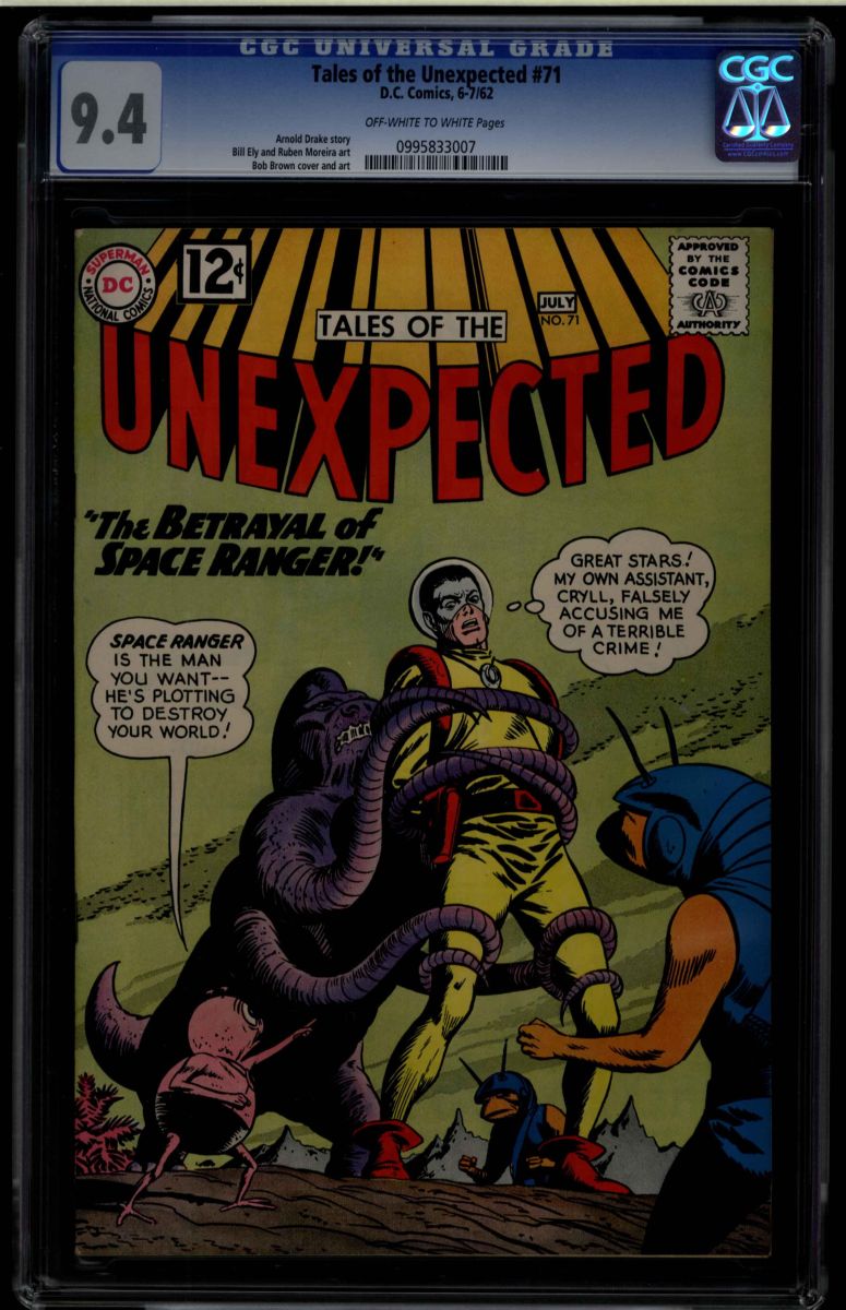 Tales Of The Unexpected #71 CGC 9.4 off-white to white. Arnold Drake story Bill Ely and Ruben Moreira art Bob Brown cover and art. Overstreet 2009 9.2 value = $135. CGC census reports 2 at 9.4, none higher!