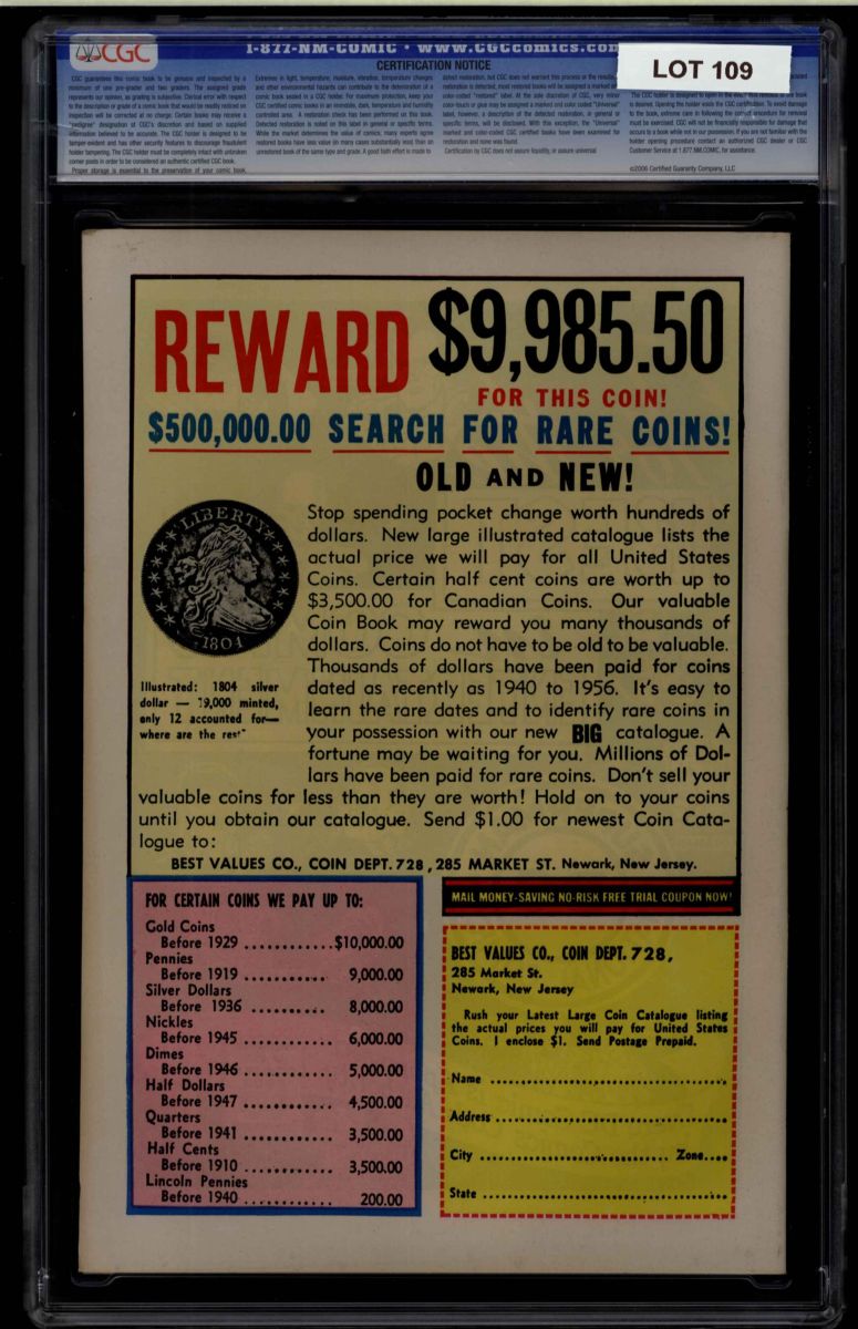 The Auctioneer has reserved the right to reject any and all bids, and to bid at the auction. Auctioneers Auctions are not on approval. Auctioneer does not allow certified material to be returned because of possible differences of opinion with respect to the grade offered by any third party organization, dealer, or service. Absolutely no guarantee of grade is offered for un-certified property sold and subsequently submitted to a third-party grading service. There will be no exceptions to this policy. Under extremely limited circumstances, (e.g. gross cataloging error) a purchaser, who did not bid from the floor, may request Auctioneer to evaluate voiding a sale; such request must be made in writing detailing the alleged gross error, and submission of the lot to the Auctioneer must be pre-approved by the Auctioneer. Bidder must notify Auctioneer in writing of such request within three (3) days of the non-floor bidder receipt of the lot. Any lot that is to be evaluated must be in our offices within 30 days after Auction. Grading does not qualify for this evaluation process nor do such complaints constitute a basis to challenge the authenticity of a lot. AFTER THAT 30-DAY PERIOD, NO LOTS MAY BE RETURNED FOR REASONS OTHER THAN AUTHENTICITY. Lots returned must be housed intact in the original holder. No lots purchased by floor Bidders may be returned (including those Bidders acting as agents for others). Late remittance for purchases may be considered just cause to revoke all return privileges. B: Auctions conducted solely on the Internet have a THREE (3) DAY RETURN POLICY: Lots paid for within seven days of the Auction closing are sold with a three (3) day return privilege. You may return lots under the following conditions: Within three days of receipt of the lot, you must first notify Auctioneer by contacting Client Service by phone (314-680-8599) or e-mail (moundcityauctions@gmail.com), and immediately mail the lot(s) fully insured to the attention of Returns, Mound City Auctions 1081 Teson Rd. Hazelwood, MO. 63042. Lots must be housed intact in their original holder and in their original condition. You are responsible for the insured, safe delivery of any lots. Auctioneer will not be responsible for lots returned in non-registered mail or lots returned without prior authorization per section B. A non-negotiable return fee of 5% of the purchase price ($10 per lot minimum) will be deducted from the refund for each returned lot or billed directly. Postage and handling fees are not refunded. After the three-day period (from receipt), no items may be returned for any reason. Late remittance for purchases revokes all Return-Restock privileges. C: Bidders who have inspected the lots prior to the auction will not be granted any return privileges. D: Comic books sold referencing a third-party grading service are sold “as is” without any express or implied warranty. Certain warranties may be available from the grading services and the Bidder is referred to them for further details: Certified Guaranty Company, LLC. (CGC), P.O. Box 4738, Sarasota, FL 34230. E: Bidders who intend to challenge authenticity or provenance of a lot must notify Auctioneer in writing within thirty (30) days of the Auctions conclusion. In the event Auctioneer cannot deliver the lot or subsequently it is established that the lot lacks title, provenance, authenticity, or other transfer or condition issue is claimed, Auctioneer's liability shall be limited to rescission of sale and refund of purchase price; in no case shall Auctioneer's maximum liability exceed the high bid on that lot, which bid shall be deemed for all purposes the value of the lot. After one year has elapsed, Auctioneer's maximum liability shall be limited to any commissions and fees Auctioneer earned on that lot. F: All comics are guaranteed genuine, but are not guaranteed as to grade, since grading is a matter of opinion, an art and not a science, and therefore the opinion rendered by the Auctioneer or any third party grading service may not agree with the opinion of others (including trained experts), and the same expert may not grade the same item with the same grade at two different times. G: Since we cannot examine encapsulated comics, they are sold “as is”without our grading opinion, and may not be returned for any reason. Auctioneer shall not be liable for any patent or latent defect or controversy pertaining to or arising from any encapsulated collectible. In any such instance, purchaser's remedy, if any, shall be solely against the service certifying the collectible. H: Due to changing grading standards over time, differing interpretations, and to possible mishandling of items by subsequent owners, Auctioneer reserves the right to grade items differently than shown on certificates from any grading service that accompany the items. Auctioneer also reserves the right to grade items differently than the grades shown in the prior catalog should such items be reconsigned to any future auction. I: Although consensus grading is employed by most grading services, it should be noted as aforesaid that grading is not an exact science. In fact, it is entirely possible that if a lot is broken out of a plastic holder and resubmitted to another grading service or even to the same service, the lot could come back with a different grade assigned. J: Certification does not guarantee protection against the normal risks associated with potentially volatile markets. The degree of liquidity for certified collectibles will vary according to general market conditions and the particular lot involved. For some lots there may be no active market at all at certain points in time."