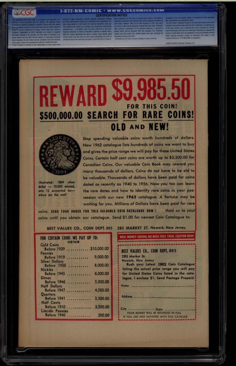 The Auctioneer has reserved the right to reject any and all bids, and to bid at the auction. Auctioneers Auctions are not on approval. Auctioneer does not allow certified material to be returned because of possible differences of opinion with respect to the grade offered by any third party organization, dealer, or service. Absolutely no guarantee of grade is offered for un-certified property sold and subsequently submitted to a third-party grading service. There will be no exceptions to this policy. Under extremely limited circumstances, (e.g. gross cataloging error) a purchaser, who did not bid from the floor, may request Auctioneer to evaluate voiding a sale; such request must be made in writing detailing the alleged gross error, and submission of the lot to the Auctioneer must be pre-approved by the Auctioneer. Bidder must notify Auctioneer in writing of such request within three (3) days of the non-floor bidder receipt of the lot. Any lot that is to be evaluated must be in our offices within 30 days after Auction. Grading does not qualify for this evaluation process nor do such complaints constitute a basis to challenge the authenticity of a lot. AFTER THAT 30-DAY PERIOD, NO LOTS MAY BE RETURNED FOR REASONS OTHER THAN AUTHENTICITY. Lots returned must be housed intact in the original holder. No lots purchased by floor Bidders may be returned (including those Bidders acting as agents for others). Late remittance for purchases may be considered just cause to revoke all return privileges. B: Auctions conducted solely on the Internet have a THREE (3) DAY RETURN POLICY: Lots paid for within seven days of the Auction closing are sold with a three (3) day return privilege. You may return lots under the following conditions: Within three days of receipt of the lot, you must first notify Auctioneer by contacting Client Service by phone (314-680-8599) or e-mail (moundcityauctions@gmail.com), and immediately mail the lot(s) fully insured to the attention of Returns, Mound City Auctions 1081 Teson Rd. Hazelwood, MO. 63042. Lots must be housed intact in their original holder and in their original condition. You are responsible for the insured, safe delivery of any lots. Auctioneer will not be responsible for lots returned in non-registered mail or lots returned without prior authorization per section B. A non-negotiable return fee of 5% of the purchase price ($10 per lot minimum) will be deducted from the refund for each returned lot or billed directly. Postage and handling fees are not refunded. After the three-day period (from receipt), no items may be returned for any reason. Late remittance for purchases revokes all Return-Restock privileges. C: Bidders who have inspected the lots prior to the auction will not be granted any return privileges. D: Comic books sold referencing a third-party grading service are sold “as is” without any express or implied warranty. Certain warranties may be available from the grading services and the Bidder is referred to them for further details: Certified Guaranty Company, LLC. (CGC), P.O. Box 4738, Sarasota, FL 34230. E: Bidders who intend to challenge authenticity or provenance of a lot must notify Auctioneer in writing within thirty (30) days of the Auctions conclusion. In the event Auctioneer cannot deliver the lot or subsequently it is established that the lot lacks title, provenance, authenticity, or other transfer or condition issue is claimed, Auctioneer's liability shall be limited to rescission of sale and refund of purchase price; in no case shall Auctioneer's maximum liability exceed the high bid on that lot, which bid shall be deemed for all purposes the value of the lot. After one year has elapsed, Auctioneer's maximum liability shall be limited to any commissions and fees Auctioneer earned on that lot. F: All comics are guaranteed genuine, but are not guaranteed as to grade, since grading is a matter of opinion, an art and not a science, and therefore the opinion rendered by the Auctioneer or any third party grading service may not agree with the opinion of others (including trained experts), and the same expert may not grade the same item with the same grade at two different times. G: Since we cannot examine encapsulated comics, they are sold “as is”without our grading opinion, and may not be returned for any reason. Auctioneer shall not be liable for any patent or latent defect or controversy pertaining to or arising from any encapsulated collectible. In any such instance, purchaser's remedy, if any, shall be solely against the service certifying the collectible. H: Due to changing grading standards over time, differing interpretations, and to possible mishandling of items by subsequent owners, Auctioneer reserves the right to grade items differently than shown on certificates from any grading service that accompany the items. Auctioneer also reserves the right to grade items differently than the grades shown in the prior catalog should such items be reconsigned to any future auction. I: Although consensus grading is employed by most grading services, it should be noted as aforesaid that grading is not an exact science. In fact, it is entirely possible that if a lot is broken out of a plastic holder and resubmitted to another grading service or even to the same service, the lot could come back with a different grade assigned. J: Certification does not guarantee protection against the normal risks associated with potentially volatile markets. The degree of liquidity for certified collectibles will vary according to general market conditions and the particular lot involved. For some lots there may be no active market at all at certain points in time."