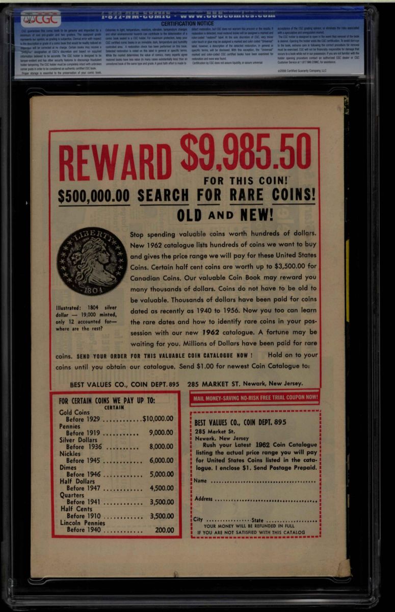 The Auctioneer has reserved the right to reject any and all bids, and to bid at the auction. Auctioneers Auctions are not on approval. Auctioneer does not allow certified material to be returned because of possible differences of opinion with respect to the grade offered by any third party organization, dealer, or service. Absolutely no guarantee of grade is offered for un-certified property sold and subsequently submitted to a third-party grading service. There will be no exceptions to this policy. Under extremely limited circumstances, (e.g. gross cataloging error) a purchaser, who did not bid from the floor, may request Auctioneer to evaluate voiding a sale; such request must be made in writing detailing the alleged gross error, and submission of the lot to the Auctioneer must be pre-approved by the Auctioneer. Bidder must notify Auctioneer in writing of such request within three (3) days of the non-floor bidder receipt of the lot. Any lot that is to be evaluated must be in our offices within 30 days after Auction. Grading does not qualify for this evaluation process nor do such complaints constitute a basis to challenge the authenticity of a lot. AFTER THAT 30-DAY PERIOD, NO LOTS MAY BE RETURNED FOR REASONS OTHER THAN AUTHENTICITY. Lots returned must be housed intact in the original holder. No lots purchased by floor Bidders may be returned (including those Bidders acting as agents for others). Late remittance for purchases may be considered just cause to revoke all return privileges. B: Auctions conducted solely on the Internet have a THREE (3) DAY RETURN POLICY: Lots paid for within seven days of the Auction closing are sold with a three (3) day return privilege. You may return lots under the following conditions: Within three days of receipt of the lot, you must first notify Auctioneer by contacting Client Service by phone (314-680-8599) or e-mail (moundcityauctions@gmail.com), and immediately mail the lot(s) fully insured to the attention of Returns, Mound City Auctions 1081 Teson Rd. Hazelwood, MO. 63042. Lots must be housed intact in their original holder and in their original condition. You are responsible for the insured, safe delivery of any lots. Auctioneer will not be responsible for lots returned in non-registered mail or lots returned without prior authorization per section B. A non-negotiable return fee of 5% of the purchase price ($10 per lot minimum) will be deducted from the refund for each returned lot or billed directly. Postage and handling fees are not refunded. After the three-day period (from receipt), no items may be returned for any reason. Late remittance for purchases revokes all Return-Restock privileges. C: Bidders who have inspected the lots prior to the auction will not be granted any return privileges. D: Comic books sold referencing a third-party grading service are sold “as is” without any express or implied warranty. Certain warranties may be available from the grading services and the Bidder is referred to them for further details: Certified Guaranty Company, LLC. (CGC), P.O. Box 4738, Sarasota, FL 34230. E: Bidders who intend to challenge authenticity or provenance of a lot must notify Auctioneer in writing within thirty (30) days of the Auctions conclusion. In the event Auctioneer cannot deliver the lot or subsequently it is established that the lot lacks title, provenance, authenticity, or other transfer or condition issue is claimed, Auctioneer's liability shall be limited to rescission of sale and refund of purchase price; in no case shall Auctioneer's maximum liability exceed the high bid on that lot, which bid shall be deemed for all purposes the value of the lot. After one year has elapsed, Auctioneer's maximum liability shall be limited to any commissions and fees Auctioneer earned on that lot. F: All comics are guaranteed genuine, but are not guaranteed as to grade, since grading is a matter of opinion, an art and not a science, and therefore the opinion rendered by the Auctioneer or any third party grading service may not agree with the opinion of others (including trained experts), and the same expert may not grade the same item with the same grade at two different times. G: Since we cannot examine encapsulated comics, they are sold “as is”without our grading opinion, and may not be returned for any reason. Auctioneer shall not be liable for any patent or latent defect or controversy pertaining to or arising from any encapsulated collectible. In any such instance, purchaser's remedy, if any, shall be solely against the service certifying the collectible. H: Due to changing grading standards over time, differing interpretations, and to possible mishandling of items by subsequent owners, Auctioneer reserves the right to grade items differently than shown on certificates from any grading service that accompany the items. Auctioneer also reserves the right to grade items differently than the grades shown in the prior catalog should such items be reconsigned to any future auction. I: Although consensus grading is employed by most grading services, it should be noted as aforesaid that grading is not an exact science. In fact, it is entirely possible that if a lot is broken out of a plastic holder and resubmitted to another grading service or even to the same service, the lot could come back with a different grade assigned. J: Certification does not guarantee protection against the normal risks associated with potentially volatile markets. The degree of liquidity for certified collectibles will vary according to general market conditions and the particular lot involved. For some lots there may be no active market at all at certain points in time."