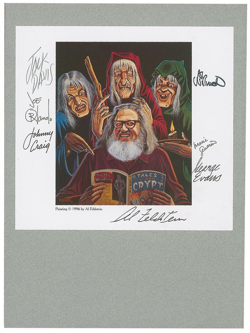 Signed book: Tales from the Crypt: The Official Archives. First edition, first printing. NY: St. Martin's Press, 1996. Hardcover, 9.25 x 12.5, 256 pages. Signed on a bookplate affixed to the inside front cover by artists Jack Davis, Joe Orlando, Johnny Craig, Al Feldstein, George Evans, and Marie Severin. In fine condition.