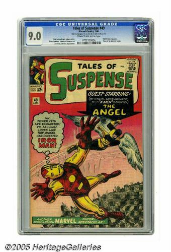<B>Tales of Suspense #49 (Marvel, 1964) CGC VF/NM 9.0 Cream to off-white pages.</B></I> This issue's Iron Man story, guest-starring the Angel, is the first X-Men crossover, and an Avengers cameo makes it <I>their</B></I> first crossover too! The story has Steve Ditko layouts with finished art by Paul Reinman. The issue also has the debut of the Watcher backup feature with Larry Lieber art. The cover's by Jack Kirby. Overstreet 2005 VF/NM 9.0 value = $657; NM- 9.2 value = $900. CGC census 6/05: 9 in 9.0, 10 higher. <I>From the collection of Joe and Nadia Mannarino.</B></I>