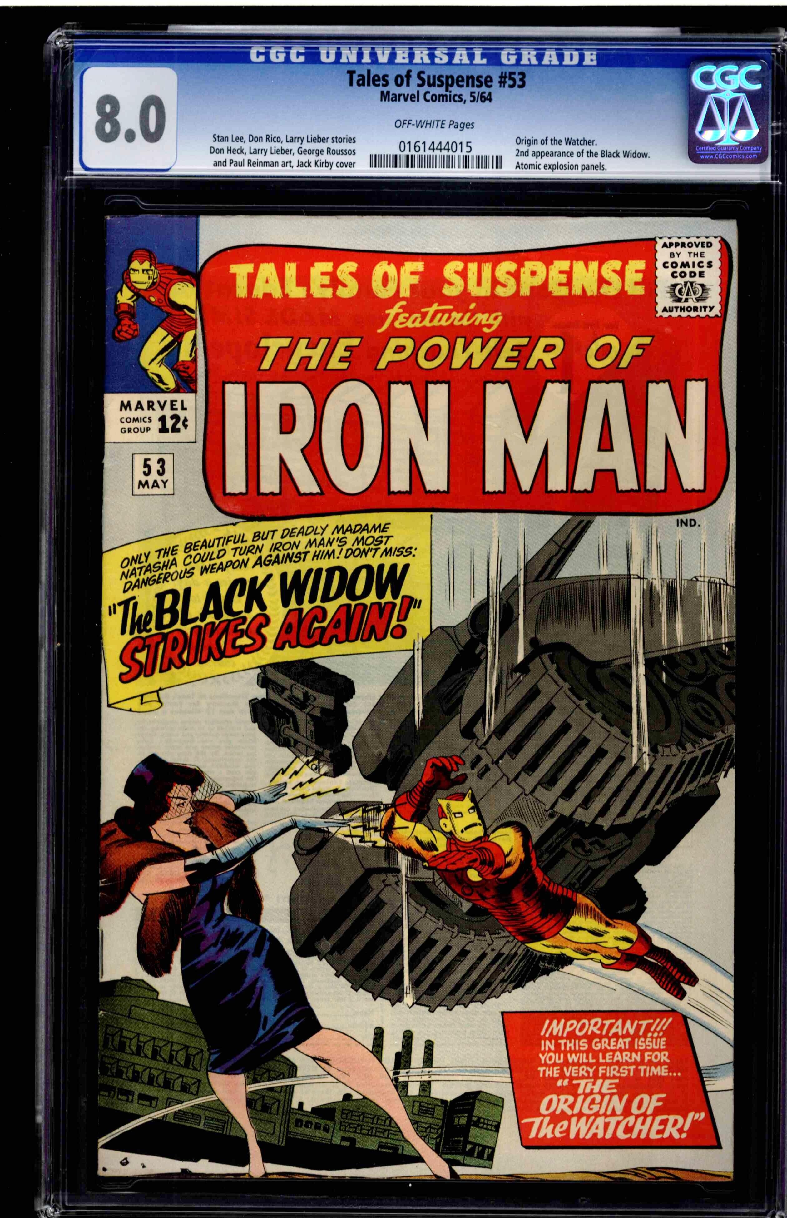 Tales of Suspense #53 CGC 8.0 off-white pages. Stan Lee, Don Rico, Larry Lieber stories. Don Heck, Larry Lieber, George Roussos and Paul Reinman art. Jack Kirby cover. Origin of the Watcher. 2nd appearance of the Black Widow. Atomic explosion panels. CGC Census: 16 at 8.0 with 39 better.