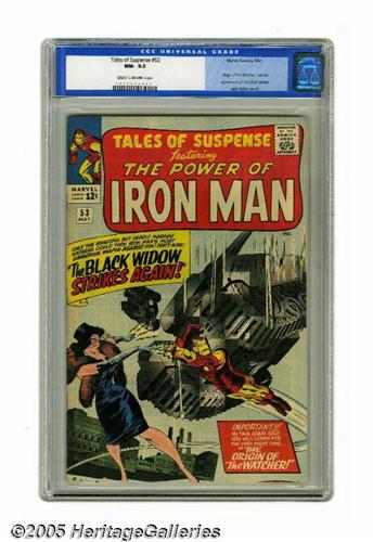 <B>Tales of Suspense #53 (Marvel, 1964) CGC NM- 9.2 Cream to off-white pages.</B></I> The Black Widow is back for her second appearance here, and it's none other then Nikita Khrushchev who sends her after the <I>Amerikanski</B></I> superhero, Iron Man. The backup feature details the origin of the Watcher. This issue's artists are Jack Kirby (cover), Don Heck (Iron Man story), and Larry Lieber (Watcher story). Overstreet 2005 NM- 9.2 value = $300. CGC census 5/05: 3 in 9.2, 11 higher.