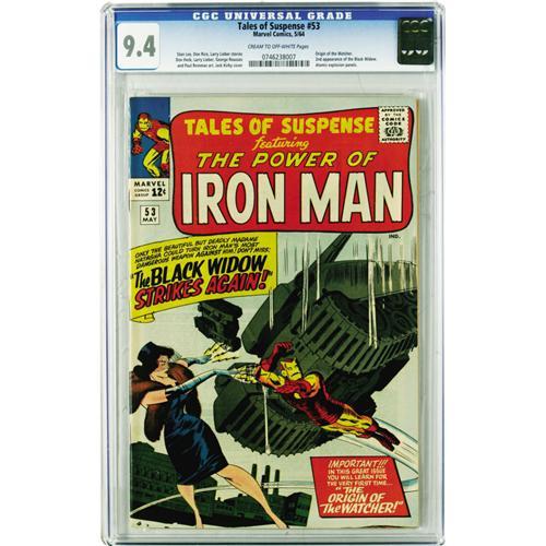 <B>Tales of Suspense #53 (Marvel, 1964) CGC NM 9.4 Cream to off-white pages.</B></I> It's va-va-voom time as the slinky Black Widow makes her second appearance (back when she was still a villainess) in an Iron Man story with Don Heck art. Also, we learn the origin of the Watcher, in backup feature with Larry Lieber art. Jack Kirby is credited with the cover. Overstreet 2006 NM- 9.2 value = $325. CGC census 3/06: 9 in 9.4, 4 higher.