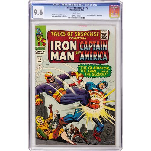<B>Tales of Suspense #76 (Marvel, 1966) CGC NM+ 9.6 White pages.</B></I> First appearances of Batroc and Sharon Carter. Jack Kirby cover, inked by John Romita Sr. Captain America story with Romita art. Iron Man story with art by Gene Colan (as Adam Austin). Overstreet 2006 NM- 9.2 value = $90. CGC census 3/07: 7 in 9.6, none higher.<BR><BR><b>Shipping:</b> Comics - Slabbed (certified) (<a target="_blank" href="http://www.heritageauctions.com/common/shipping.php">view shipping information</a>)