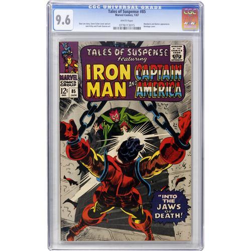 <B>Tales of Suspense #85 (Marvel, 1967) CGC NM+ 9.6 White pages.</B></I> This is the best copy we've ever seen of this one! Gene Colan supplied the cover art, and in addition to Iron Man, there's a Captain America story (drawn by Jack Kirby) featuring that French <I>savate </B></I>master, Batroc the Leaper, a somewhat different type of villain who fights with <I>l'honneur</B></I>! Overstreet 2006 NM- 9.2 value = $80. CGC census 3/07: 5 in 9.6, 1 higher.<BR><BR><b>Shipping:</b> Comics - Slabbed (certified) (<a target="_blank" href="http://www.heritageauctions.com/common/shipping.php">view shipping information</a>)