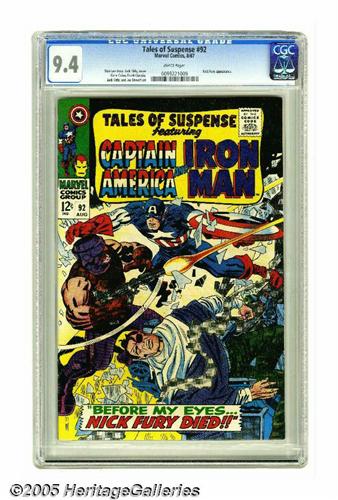 <B>Tales of Suspense #92 (Marvel, 1967) CGC NM 9.4 White pages.</B></I> First crossover appearance of Nick Fury, Agent of S.H.I.E.L.D. The Avengers also appear. Jack Kirby cover. Interior art by Kirby (Captain America story) and Gene Colan (Iron Man story). Overstreet 2005 NM- 9.2 value = $80. CGC census 3/05: 20 in 9.4, 3 higher.