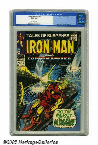 <B>Tales of Suspense #99 (Marvel, 1968) CGC NM+ 9.6 Off-white pages.</B></I> Last issue of the title. Captain America story, guest-starring the Black Panther (Jack Kirby art). Iron Man story with Gene Colan art. Cover by Colan. Overstreet 2005 NM- 9.2 value = $105. CGC census 6/05: 6 in 9.6, none higher.
