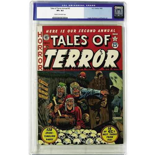 <B>Tales of Terror Annual #2 (EC, 1952) CGC VF+ 8.5 Cream to off-white pages.</B></I> These annuals, which weren't distributed nationally, have content consisting of re-bound copies of other EC comics. It's all wrapped in an Al Feldstein cover with not one, not two, but all three of EC's GhouLunatics, namely the Vault Keeper, the Old Witch, and the Crypt-Keeper. Overstreet 2006 VF 8.0 value = $1,721; VF/NM 9.0 value = $2,361. CGC census 1/06: 1 in 8.5, 2 higher.