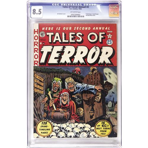 <B>Tales of Terror Annual #2 (EC, 1952) CGC VF+ 8.5 Off-white pages.</B></I> We hadn't seen a high-grade copy of this one in years! Three factors that make it very tough to find in such nice condition: the square bound format, the fact that there are no Gaines File copies of this book, and the limited distribution of these annuals. The contents of every copy of this issue are different from the next (these annuals contained four unsold EC comics, re-bound without the original covers), but the real eye-catcher is Al Feldstein's cover art, perhaps the best group portrait ever done of EC's three GhouLunatics, the Vault-Keeper, the Old Witch, and the Crypt-Keeper. Overstreet 2006 VF 8.0 value = $1,721; VF/NM 9.0 value = $2,361. CGC census 5/06: 2 in 8.5, 2 higher. <BR><BR><B>Important notice:</B> Heritage usually auctions material at the rate of 200-250 lots per hour. On some occasions eBay Live bid software or the Internet may not be able to keep up with the pace of the auction. We recommend placing a realistic absentee bid now as insurance to avoid disappointment. Occasionally the auctioneer may eliminate or reject an eBay Live bid, and the auctioneer may also reopen a lot after the close of the eBay live bidding (usually because we missed an audience bid), and may reject your bid even if it shows you as the winning bidder. By bidding via eBay Live, you agree that Heritage may award the lot to another bidder at its sole discretion under the circumstances described above or any other reasonable circumstances. Since eBay bids are not shown to us until we open the lot on the floor, we treat those bids just like floor bids. In most cases the floor responds before the eBay bid is presented to us, due to Internet lag time, so for consistency we have made it a policy that floor bids are always considered first over tie eBay live bids. Also please note that all Heritage lots purchased through eBay Live carry a 22.5% Buyer's Premium. Please make sure you read the Terms and Conditions before you bid. This lot is being auctioned in conjunction with a live floor auction by Heritage Auction Galleries. All final auction and invoice information will be supplied by Heritage Auction Galleries, and all other information should be considered preliminary. Lot:41001 <BR><BR><B>Winning Notification and Billing:</B> After the FINAL session in this auction is complete, Heritage will send e-mail and snail mail invoices. This process normally takes several days. All final auction and invoice information will be supplied by Heritage Auction Galleries, and all other information should be considered preliminary. <BR><BR>This auction will be conducted on a live auction floor and over the Internet through eBay Live. If you choose to place an absentee bid, please take a moment to <font color='#0000ff'><u><a href='http://pages.ebay.com/liveauctions/help/before/laabsentee.html'>learn how eBay Live absentee bidding works</a></u></font><font color='#000000'>