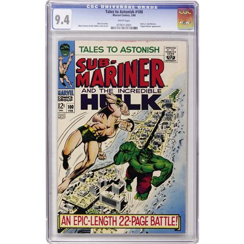 <B>Tales to Astonish #100 (Marvel, 1968) CGC NM 9.4 White pages.</B></I> Nice page quality on this copy. The Hulk battles the Sub-Mariner. The Puppet Master appears. Cover and art by Marie Severin and Dan Adkins. Overstreet 2006 NM- 9.2 value = $90. CGC census 3/07: 20 in 9.4, 16 higher.<BR><BR><b>Shipping:</b> Comics - Slabbed (certified) (<a target="_blank" href="http://www.heritageauctions.com/common/shipping.php">view shipping information</a>)