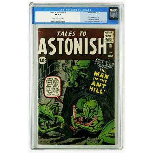 <B>Tales to Astonish #27 (Marvel, 1962) CGC VF 8.0 Cream to off-white pages.</B></I> This is the most valuable issue of the series thanks to the first appearance of Henry Pym. The name Ant-Man was adopted later, here he's "The Man in the Ant Hill" and we find out the origin of the potion that gives him his shrinking power. The dramatic story was drawn by Jack Kirby, who drew the cover as well. Steve Ditko, Don Heck, and Bob Forgione each drew one "mystery"-type backup feature in the issue. Overstreet 2005 VF 8.0 value = $2,910. CGC census 12/05: 8 in 8.0, 8 higher.