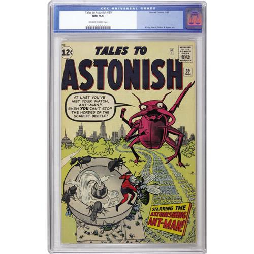 <B>Tales to Astonish #39 (Marvel, 1963) CGC NM 9.4 Off-white to white pages.</B></I> If you're like us, you've seen some copies of this issue that look like Ant-Man's insect pals had their way with them -- what a refreshing sight it is to see a NM copy! Jack Kirby drew the cover and the Ant-Man story (an early appearance for Mr. Pym). Meanwhile, Steve Ditko and Don Heck each penciled a "weird mystery" tale of the sort that filled this series before Ant-Man came along. Overstreet 2006 NM- 9.2 value = $725. CGC census 9/06: 6 in 9.4, 4 higher.<BR><BR><b>Shipping:</b> Slabbed Comic (<a target="_blank" href="http://www.heritageauctions.com/common/shipping.php">view shipping information</a>)