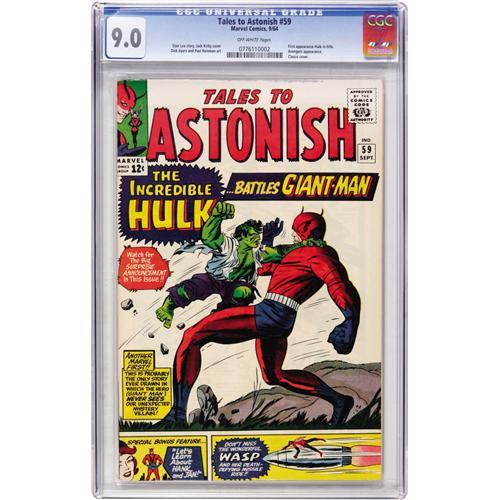 <B>Tales to Astonish #59 (Marvel, 1964) CGC VF/NM 9.0 Off-white pages.</B></I> First appearance of Hulk in the title. Avengers appearance. Jack Kirby cover. Dick Ayers and Paul Reinman art. Overstreet 2006 VF/NM 9.0 value = $364; NM- 9.2 value = $500. CGC census 3/07: 11 in 9.0, 19 higher.<BR><BR><b>Shipping:</b> Comics - Slabbed (certified) (<a target="_blank" href="http://www.heritageauctions.com/common/shipping.php">view shipping information</a>)