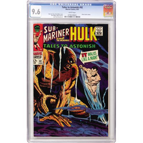 <B>Tales to Astonish #92 (Marvel, 1967) CGC NM+ 9.6 White pages.</B></I> Sub-Mariner and Hulk features. Dan Adkins cover. Overstreet 2006 NM- 9.2 value = $80. CGC census 3/07: 6 in 9.6, 2 higher.<BR><BR><b>Shipping:</b> Comics - Slabbed (certified) (<a target="_blank" href="http://www.heritageauctions.com/common/shipping.php">view shipping information</a>)