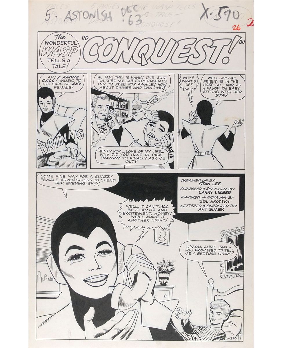 Fantastic half-page splash original comic art for Tales to Astonish #54, hand-drawn in pencil by Larry Lieber and inked by Sol Brodsky on an off-white 13.5 x 21 cardstock sheet of illustration paper, created in December 1963 for publication in April 1964. In fine condition. The Wasp was a founding member of the Avengers, and 1960s title splashes featuring the Wasp are difficult to come by and extremely desirable.