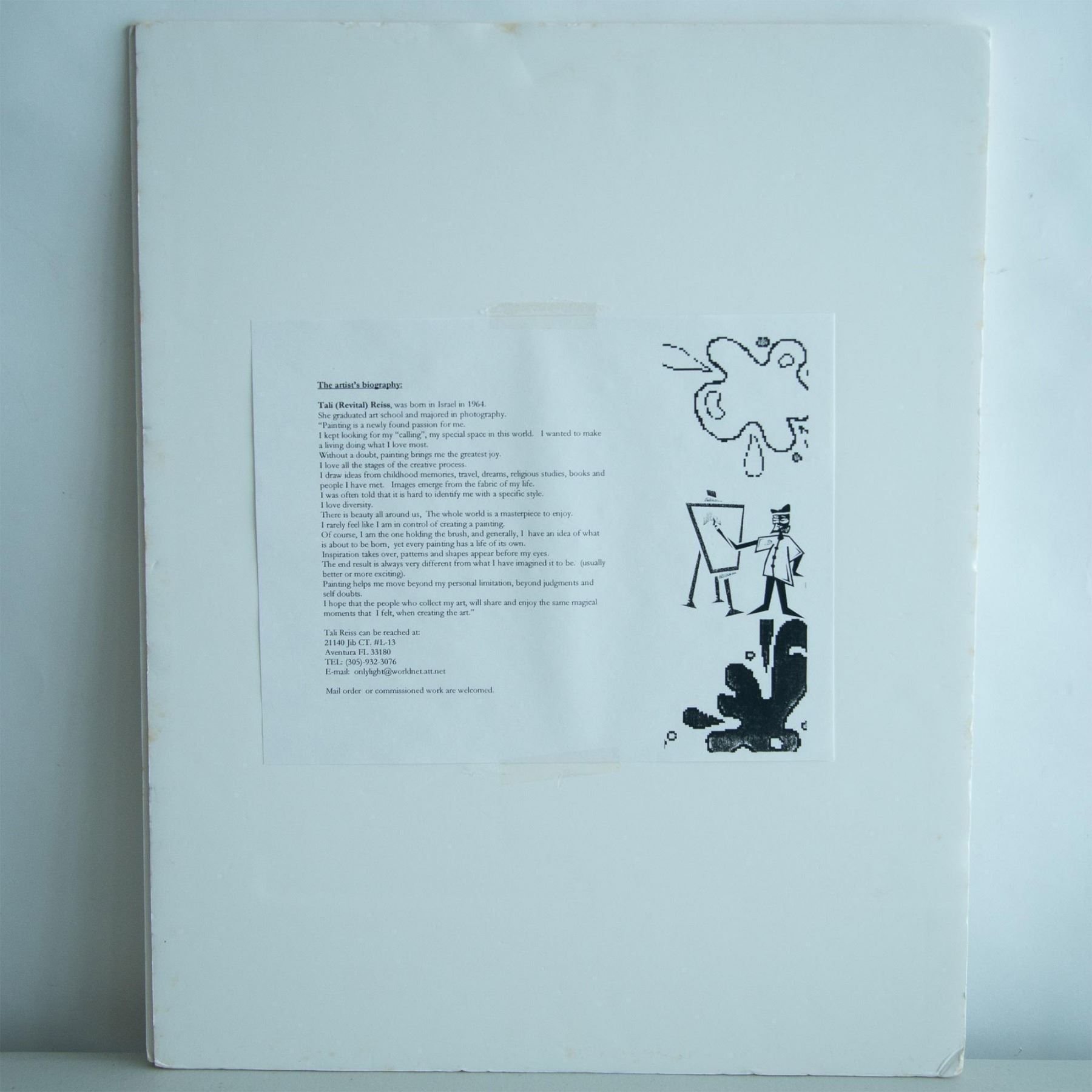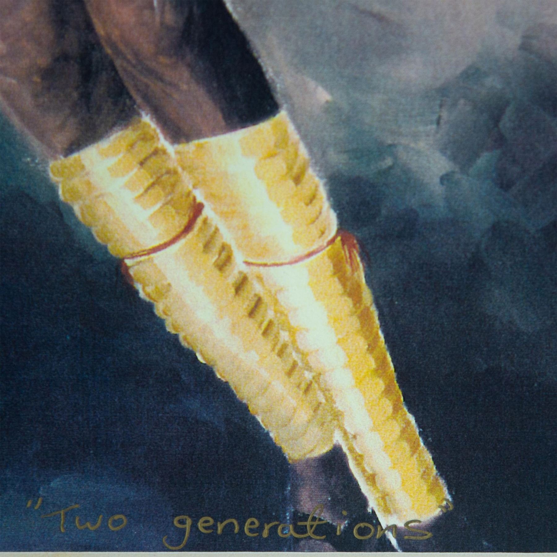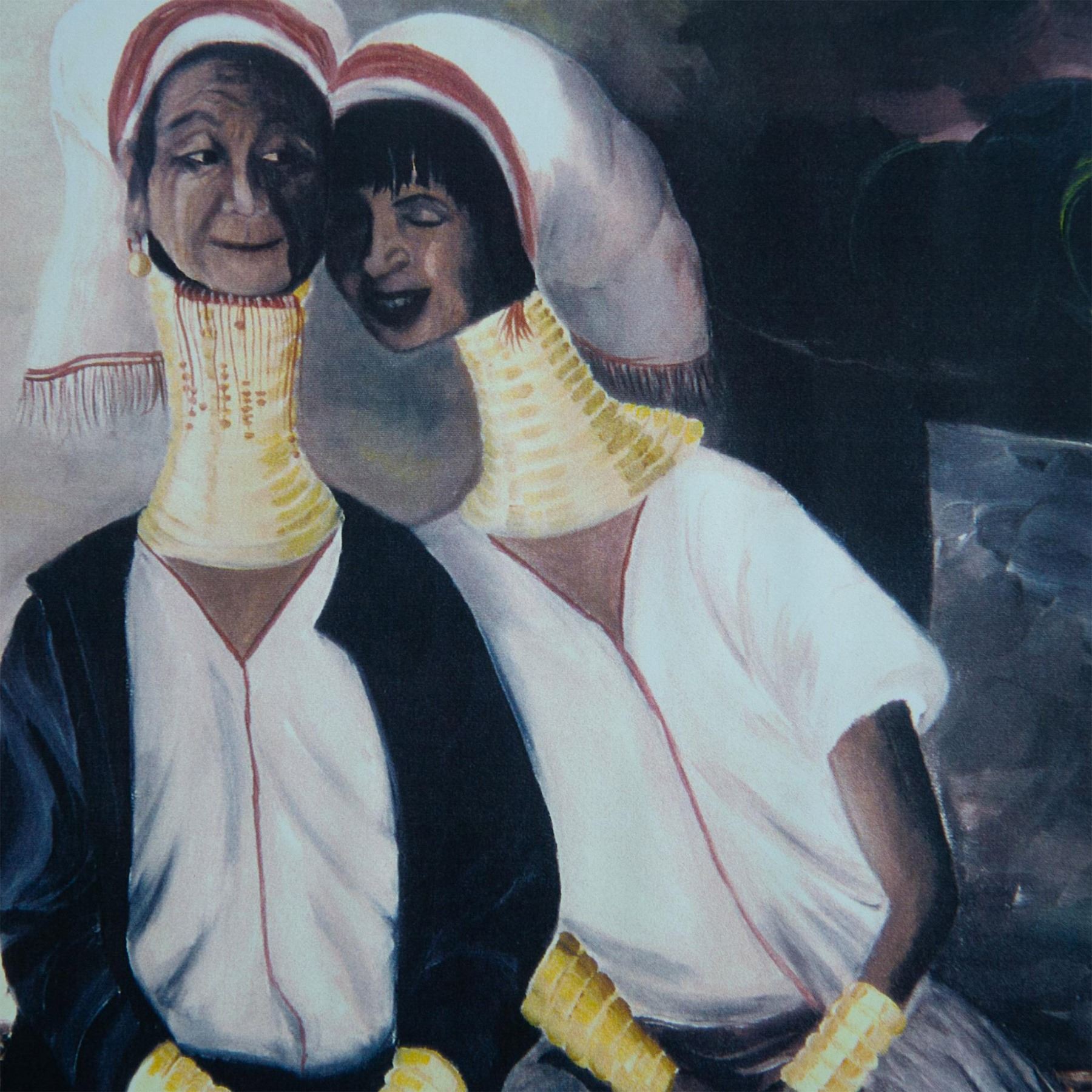 Two Generations depicts two women from the Kayan Long Neck Tribe located in Thailand and is based on a painting by Floridian artist Tali Weiss. Includes an artist biography on the back of mat. Signature in ink on lower left: Tali Reiss. Title on lower right: Two Generations. Sight dimensions: 10"L x 14"H. Mat size: 16"L x 20"H.