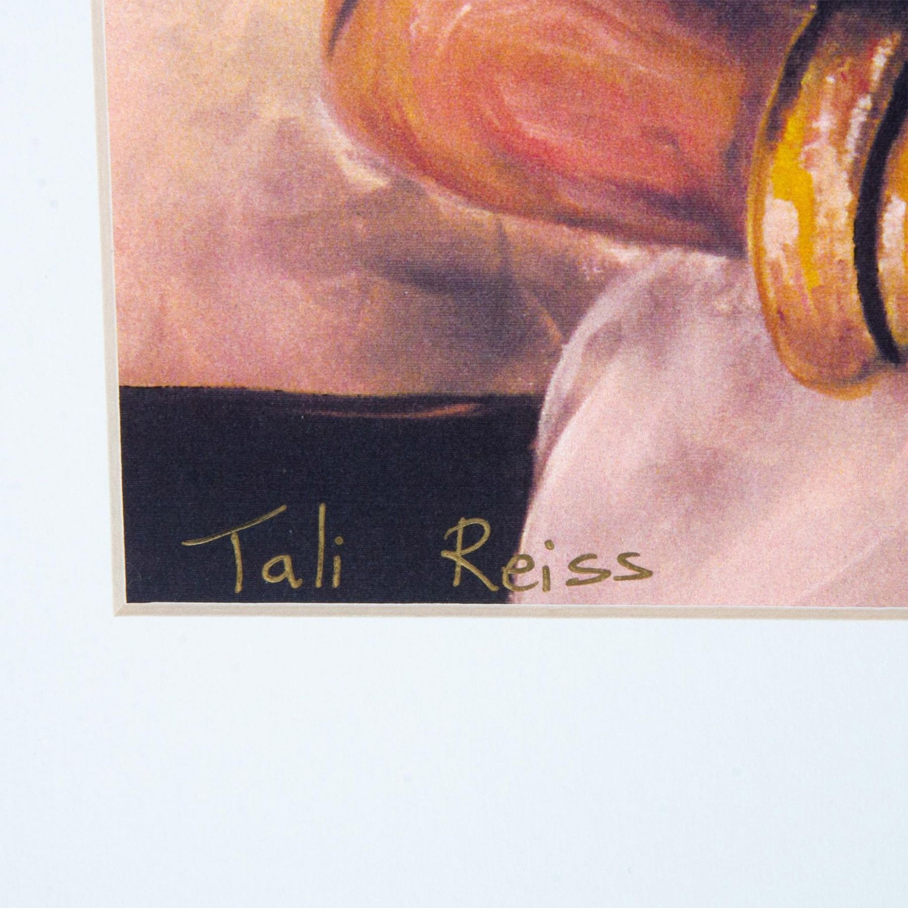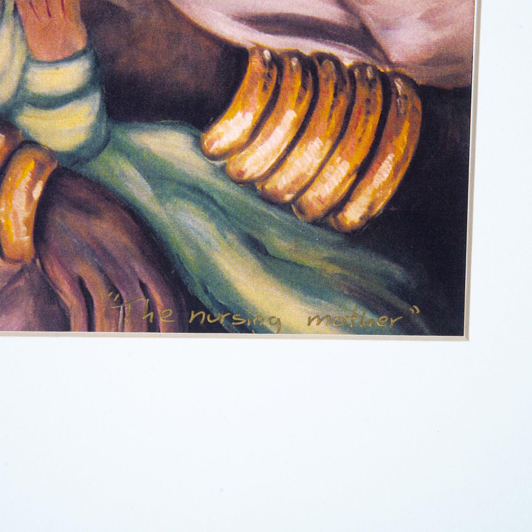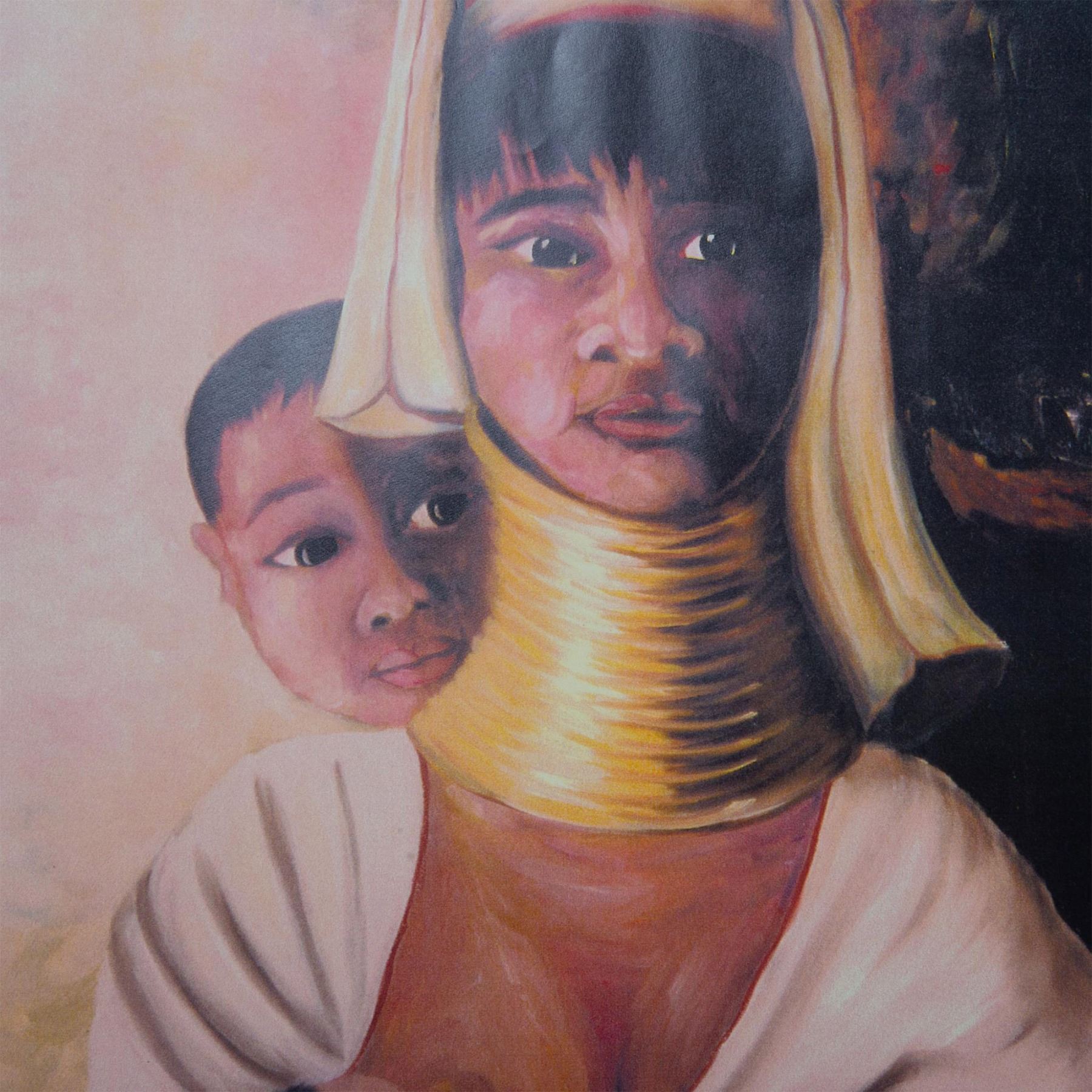 The Nursing Mother depicts a woman from the Kayan Long Neck Tribe located in Thailand breastfeeding her infant while a young child looks over her shoulder. This matted color print on paper is based on Floridian artist Tali Weiss' painting. Includes an artist biography on the back of mat. Signature in ink on lower left: Tali Reiss. Title on lower right: The Nursing Mother. Sight dimensions: 10"L x 14"H. Mat size: 16"L x 20"H.