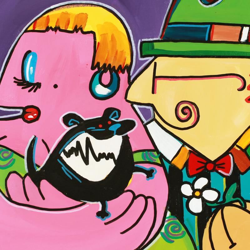 Talk To The Dog By Maimon Original. "Talk To The Dog " is an original acrylic painting on canvas by Rina Maimon, hand signed by the artist and includes a certificate of authenticity. Measures approximately 21" x 21"
