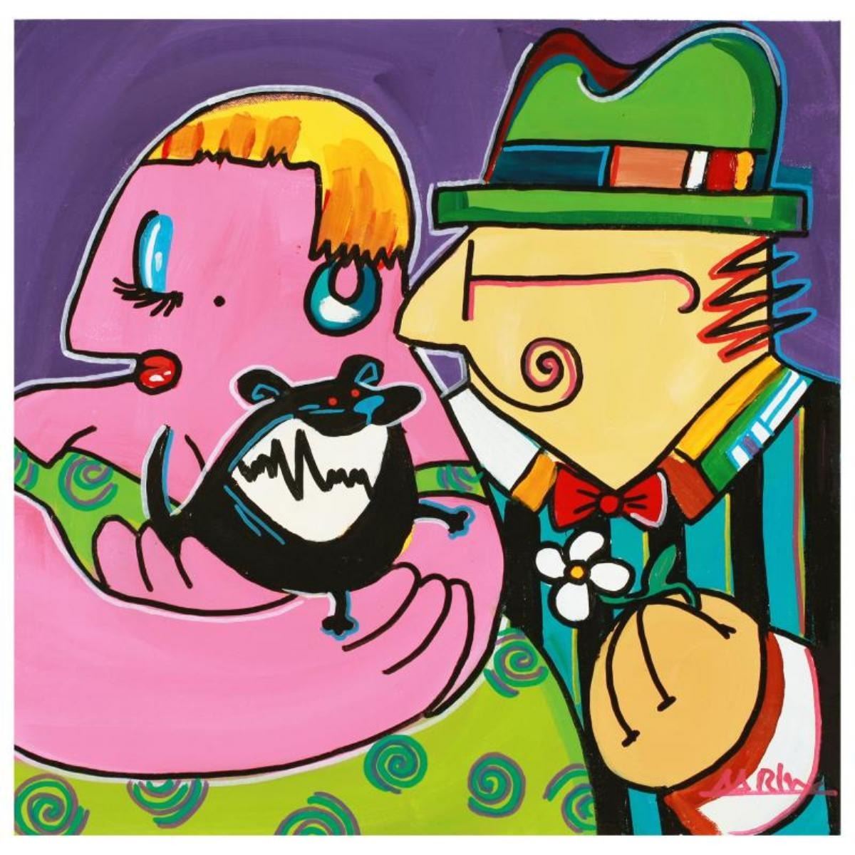 "Talk To The Dog " is an original acrylic painting on canvas by Rina Maimon, hand signed by the artist and includes a certificate of authenticity. Measures approximately 21" x 21"