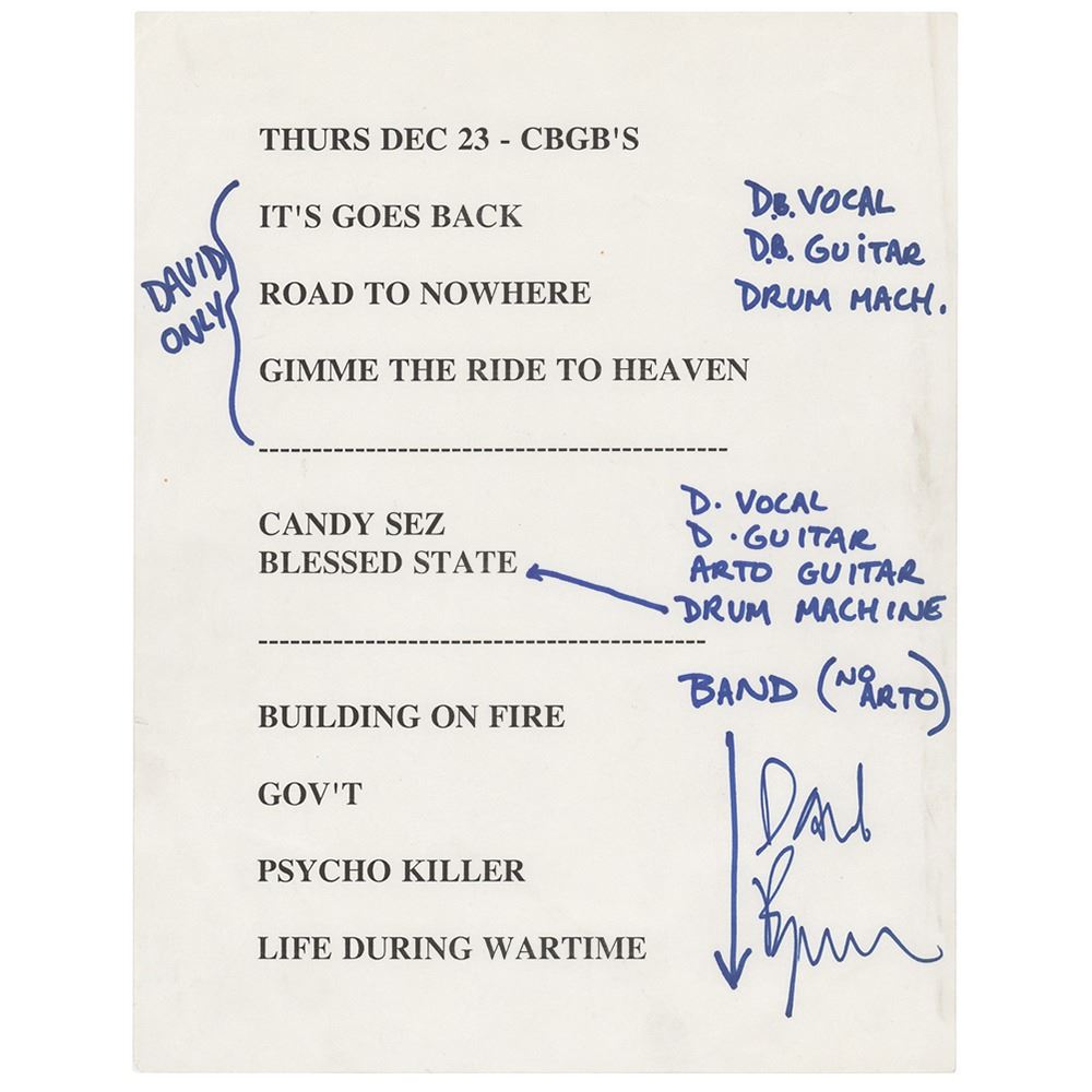 Set list for a David Byrne concert at the CBGB music club in New York City on December 23, 1993, 8.5 x 11, signed in the lower right in blue felt tip by Byrne, with another hand adding notes to the show's three sets. Songs include 'It Goes Back,' 'Road to Nowhere,' 'Gimme the Ride to Heaven,' 'Candy Sez,' 'Blessed State,' 'Building on Fire,' 'Gov't,' 'Psycho Killer,' and 'Life During Wartime.' In fine condition.