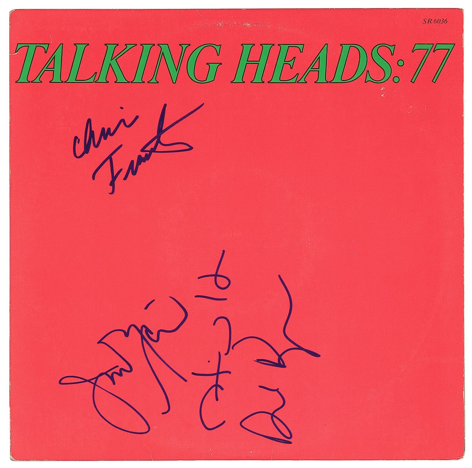 Talking Heads: 77 album signed on the front cover in blue felt tip by David Byrne, Chris Frantz, Jerry Harrison, and Tina Weymouth. In fine condition, with light scuffing. The record is included. A desirable example of the Talking Heads' debut, featuring the single 'Psycho Killer.'