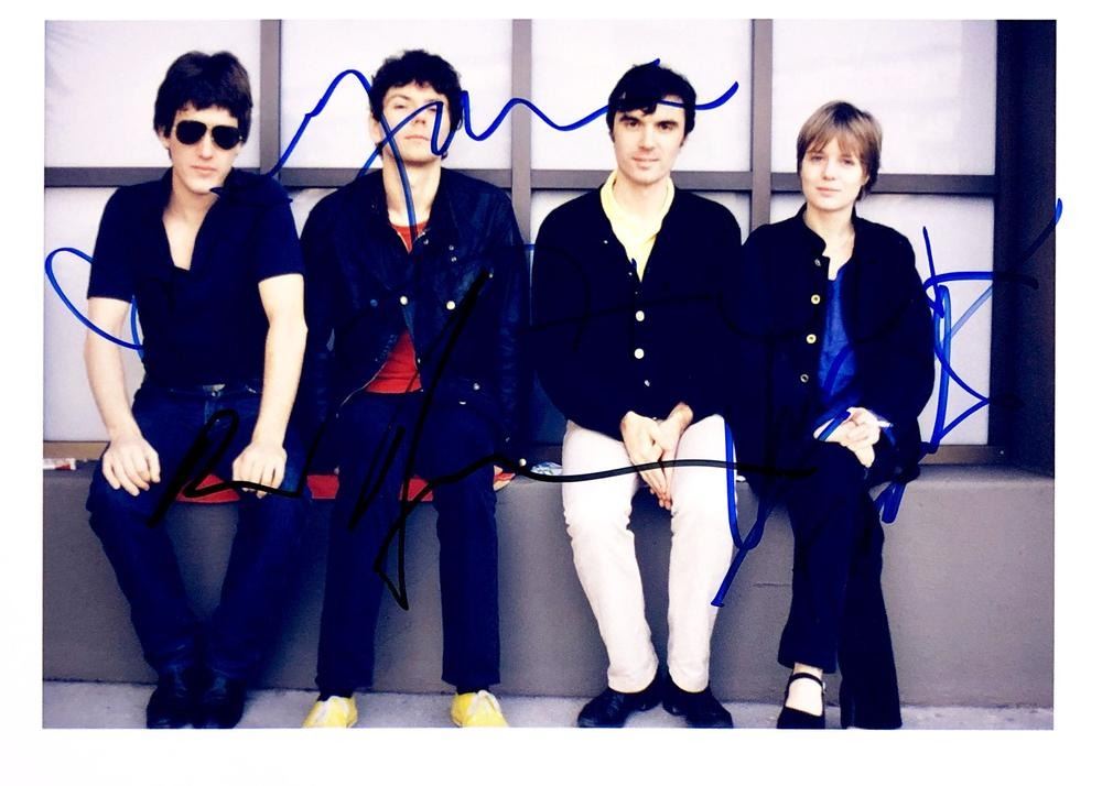 Talking Heads facsimile signed photo autographed by David Byrne, Jerry Harrison, Chris Frantz and Tina Weymouth. 8x10 inches. This item is a reprint of an original autograph