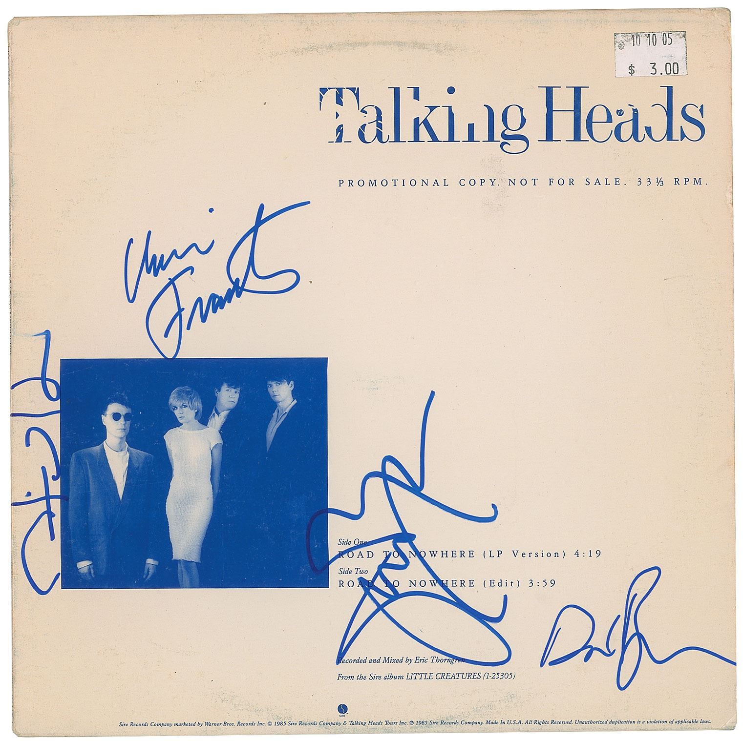 Promotional album for the single 'Road to Nowhere,' signed on the front cover in blue felt tip by David Byrne, Jerry Harrison, Tina Weymouth, and Chris Frantz. In fine condition, with light scuffing, and an affixed price sticker. The record is included.