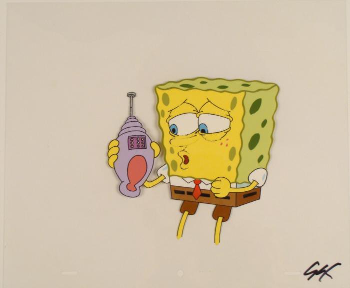 This original animation cel is from the Nickelodeon TV show SpongeBob Squarepants. The story takes place under the deep blue sea in Bikini Bottom, where SpongeBob resides. SpongeBob, who is a yellow, porous sponge, is your typical happy-go-lucky character, as he is always cheerful and enjoys making people laugh. Patrick Star, SpongeBob's neighbor who is a starfish, is your average children's show idiot, as he boasts knowing nothing and is often getting himself into ridiculous situations. Between the homes of these two lies the home of the miserable Squidward, a squid, who is known for being grouchy and playing tricks on SpongeBob and Patrick. Both SpongeBob and Squidward work at the Krusty Krab, a fast food business run by the greedy money-loving Mr. Krabs, a crab, the arch rival of the evil, possibly misunderstood, Plankton. Another neighbor, Sandy Cheeks, an athletic squirrel who normally wears an astronaut's space suit, was introduced in "Tea at the Treedome." She spends most of her time inventing and experimenting. SpongeBob is talking on the phone.Original Production Animated Cel Overall Size of Cel: 10 1/2" x 12 1/2" Very Good ConditionThis is an original hand-painted cel set-up used in the production of an episode of "SpongeBob SquarePants." Each one-of-a-kind set-up represents a slight change in position of the characters. When individually photographed and projected in rapid succession, the images appear to move.