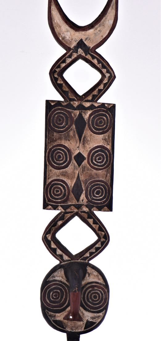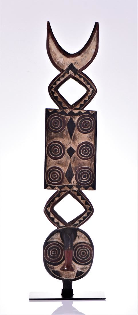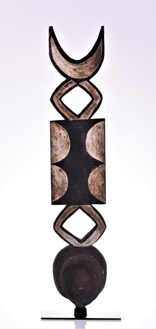 Tall African Bwa, Burkina Faso polychrome and carved wood 'Nwantantay' plank mask. Size 43 x 8 x 7 inches. The imagery found in masks of the Bobo, Bwa, Kurumba, Mossi, and others living in Burkina Faso commonly combine the stylized features of humans, animals, and even insects. Bold geometric shapes repeated in brightly painted designs enliven the surfaces of these relatively abstract forms. When used in performances the masks embody nature or ancestor spirits that interact with human beings and influence their lives. They appear at important funerals to honor the dead and escort the deceased's soul to the world beyond. They also dance at agricultural festivities to ensure the proper progression of the seasons, and at initiation rituals to help introduce young men and women to the secrets and responsibilities of adulthood. Estimated more than 50 yrs old. (Photos Represent The Lot Condition. Read T&C's)