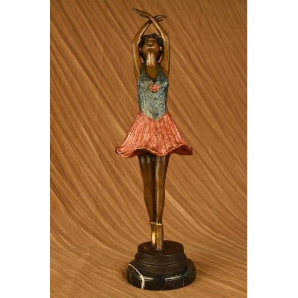 When you look over the sculpture and the depth and warmth of the patina meet your eye, it sends a sense of calmness and gracefulness. It is almost as if the sculpture is a picture of a lullaby in still motion. She points her toe, carefully and gracefully she turns her body, even her fingers are positioned in a polite manner. Her beautifully proportioned body is accented by the ballet dress she wears. Creasing with gravity and fluid movement, the bodice is similar to a corset adorned with beautiful roses by her left shoulder. The skirt is wide and flowing at the hips giving nice dimension to the dancer. On her feet, she wears ballet slippers that crisscross around her ankles and tie. Her hair is tied back split into pigtails and tied up again into such fine proper buns. Her face has delicate features, with high cheeks bones, a small pointy nose, wide innocent accepting eyes, and a smile that cannot be forgotten, its no wonder why the prince asked for her hand in marriage. She was captured using the thousand-year-old method of lost-wax casting and stained with a brown patina stain for preservation and mounted atop a marble base. Dimensions: Height 21 X Width 6 inches. Weight: 11 LBS.