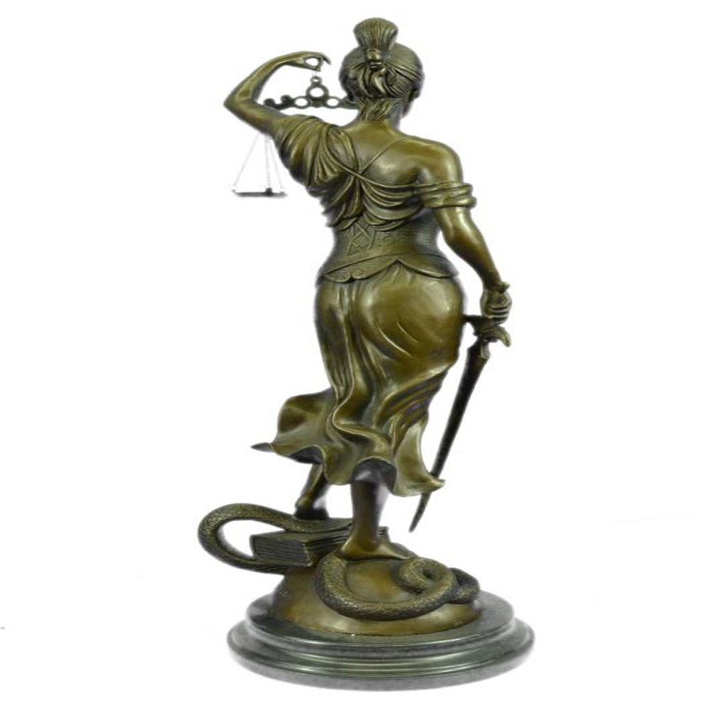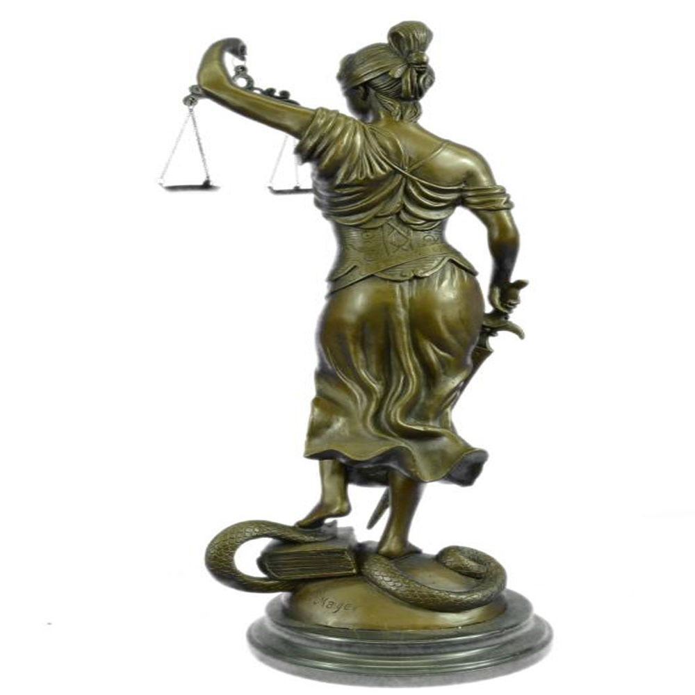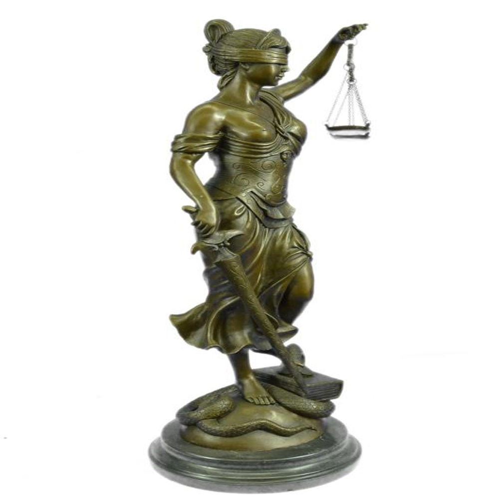 The bronze sculpture is of Lady Justice Roman goddess of Justice who is the symbolic personification of the moral force in judicial systems. As anciently depicted, the blindfolded Lady Justice, is seen balancing the scales of truth and fairness from her left hand, holdings sword, while stepping on a book and a snake that coils around her feet. The scales, represent truth and fairness and measures the strength of a case support and opposition. The blindfold, represents objectivity, in that justice is or should be meted out objectively without biases. The sword, symbolizes the power of reason and justice,which may be wielded either for or against any party. The book represents history, signifying to stand against wrongdoings or with the good doings of the past. The snake symbolizes hatred hence the foot that stops it from getting its grip. She was captured using the age old method of lost wax casting and stained with a brown patina finish and is mounted upon a marble base. Bronze Dimensions with Marble Base: Height 23 X Width 10 inches. Weight: 22 LBS.