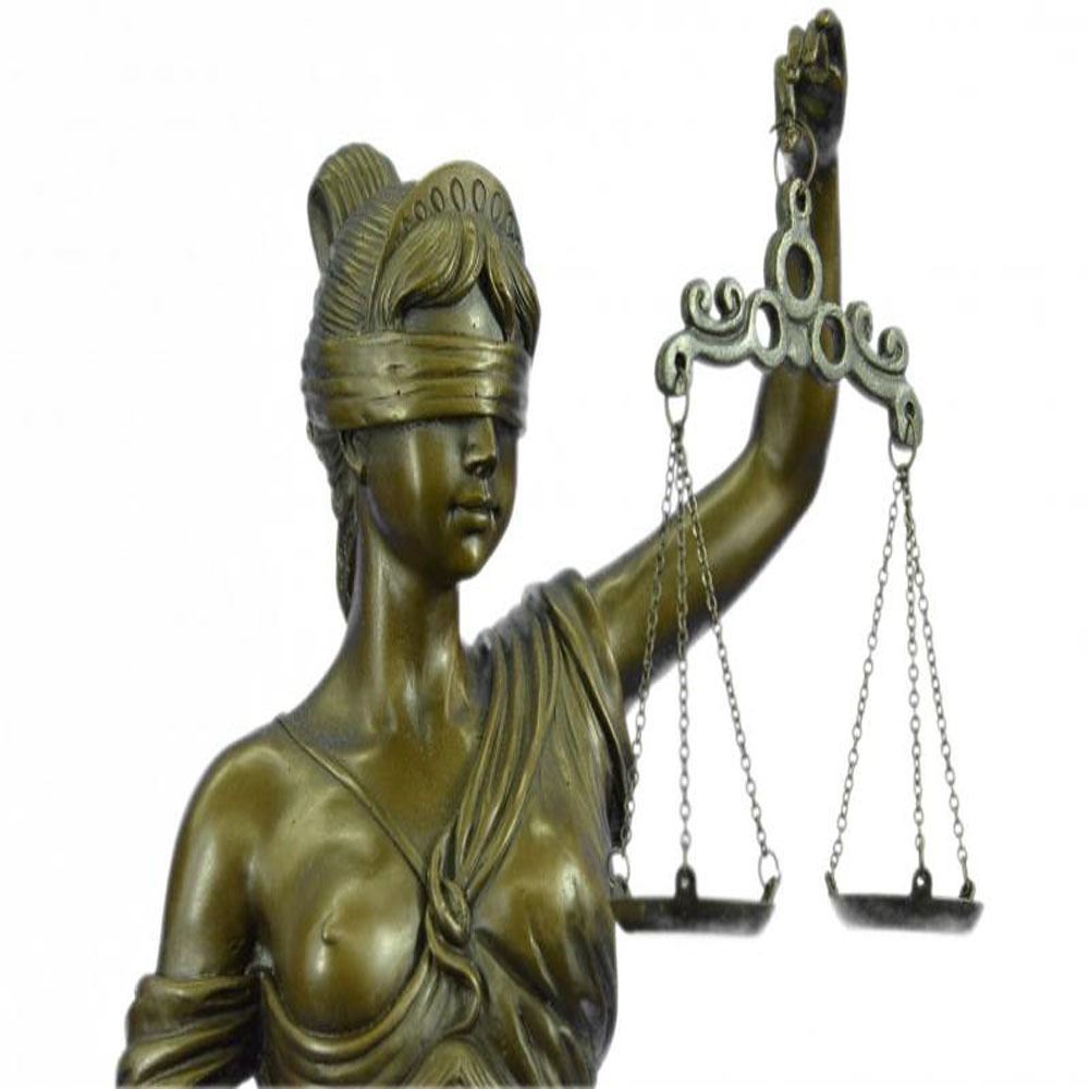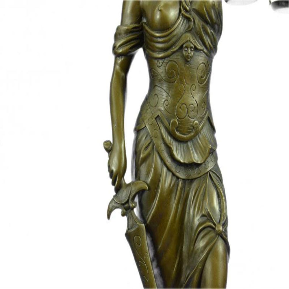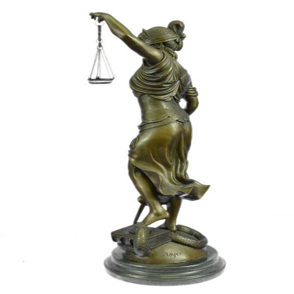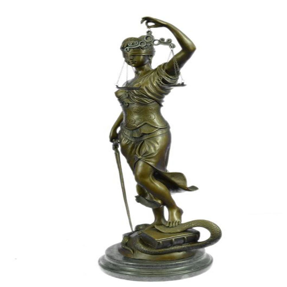 The bronze sculpture is of Lady Justice Roman goddess of Justice who is the symbolic personification of the moral force in judicial systems. As anciently depicted, the blindfolded Lady Justice, is seen balancing the scales of truth and fairness from her left hand, holdings sword, while stepping on a book and a snake that coils around her feet. The scales, represent truth and fairness and measures the strength of a case support and opposition. The blindfold, represents objectivity, in that justice is or should be meted out objectively without biases. The sword, symbolizes the power of reason and justice,which may be wielded either for or against any party. The book represents history, signifying to stand against wrongdoings or with the good doings of the past. The snake symbolizes hatred hence the foot that stops it from getting its grip. She was captured using the age old method of lost wax casting and stained with a brown patina finish and is mounted upon a marble base. Bronze Dimensions with Marble Base: Height 23 X Width 10 inches. Weight: 22 LBS.