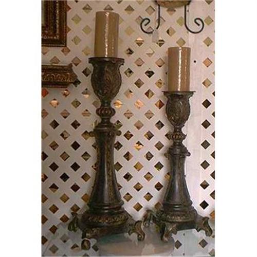 Candlesticks, a pair of beautiful tall candlesticks with a leaf and vine design. One candlestick measures 22 inches high and the other 18 inches. Made of some type of man-made material. Both are in excellent, new, never used condition. The candles are included.