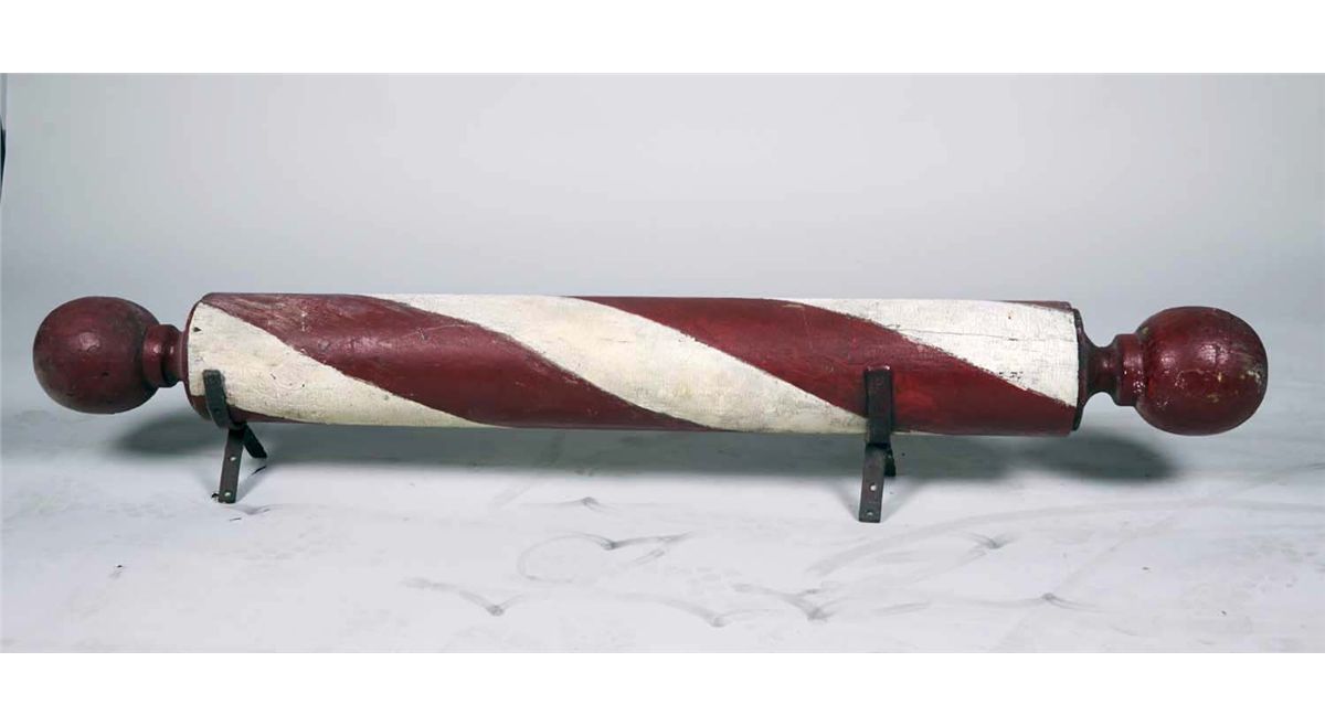 Painted wood barber pole advertising sign with corner mounting brackets, paint is alligatored, circa 1920's. Condition (Good). Size 7" x 60"