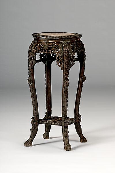 ca 1880-1890, rosewood carved top with inset scalloped marble top. With lower pierced and carved shelf connecting four s-curved legs, ending in paw feet; 37" high x 16" wide at top.